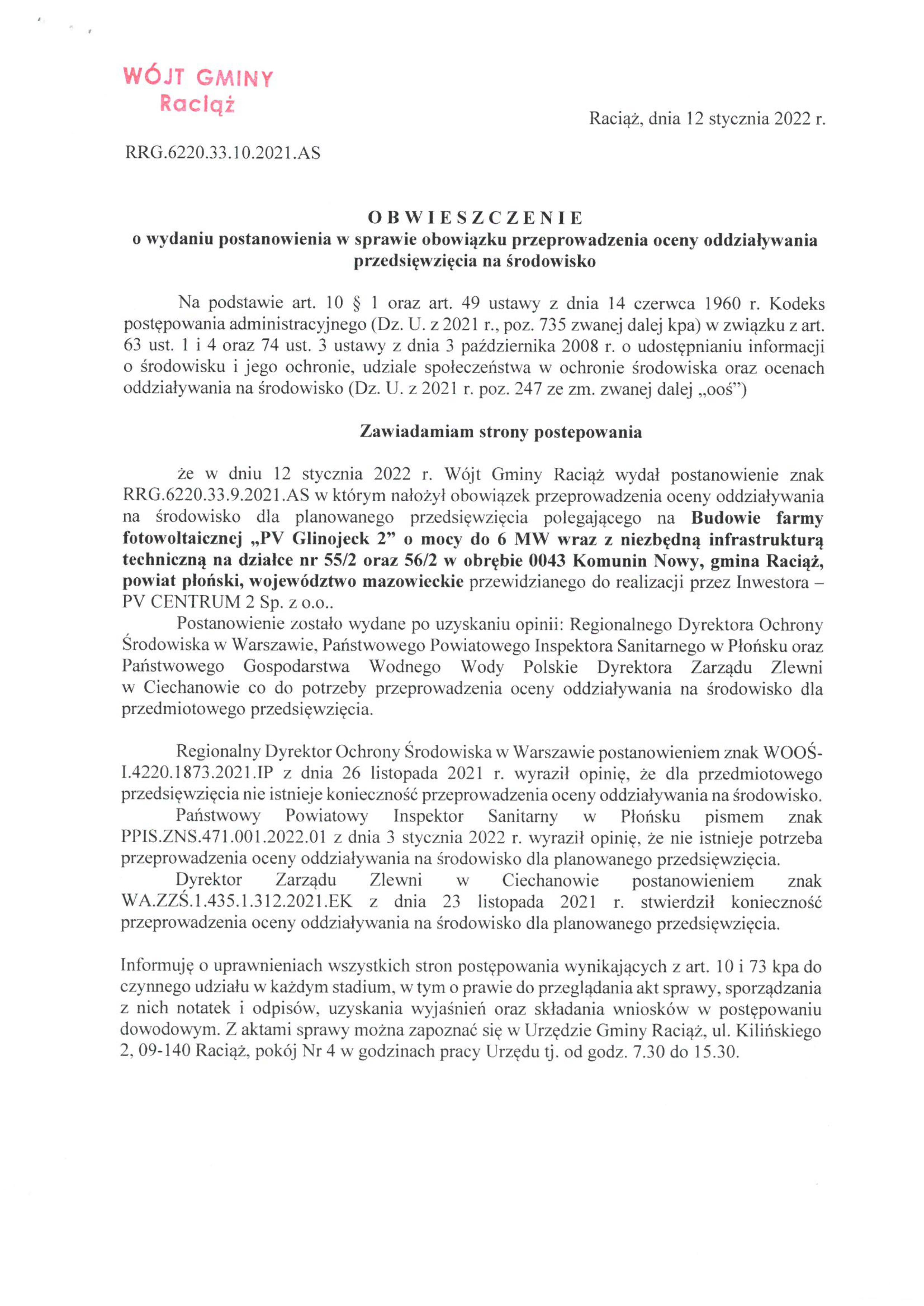 Budowa farmy fotowoltaicznej „PV Glinojeck 2” o mocy do 6 MW wraz z niezbędną infrastrukturą techniczną na działce nr 55/2 oraz 56/2 w obrębie 0043 Komunin Nowy, gmina Raciąż, powiat płoński, województwo mazowieckie