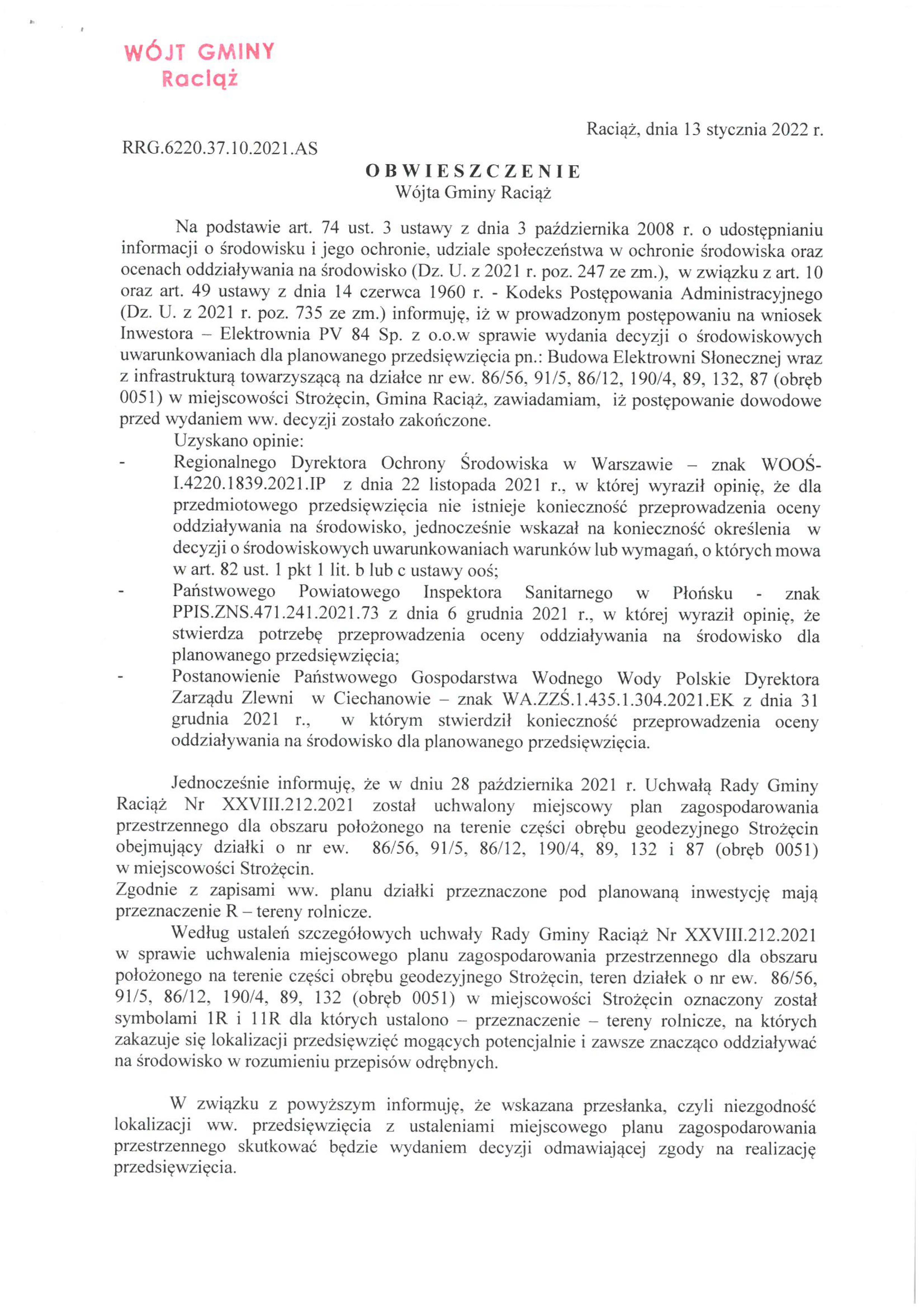Budowa Elektrowni Słonecznej wraz z infrastrukturą towarzyszącą na działce nr ew. 86/56, 91/5, 86/12, 190/4, 89, 132, 87 (obręb 0051) w miejscowości Strożęcin, Gmina Raciąż