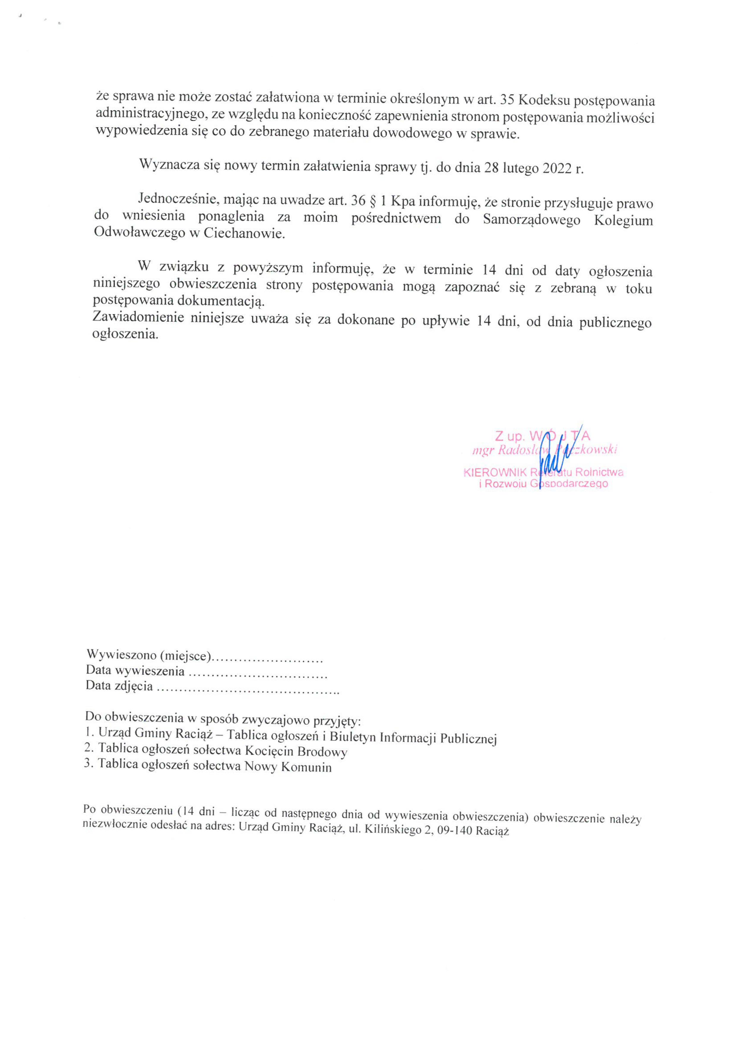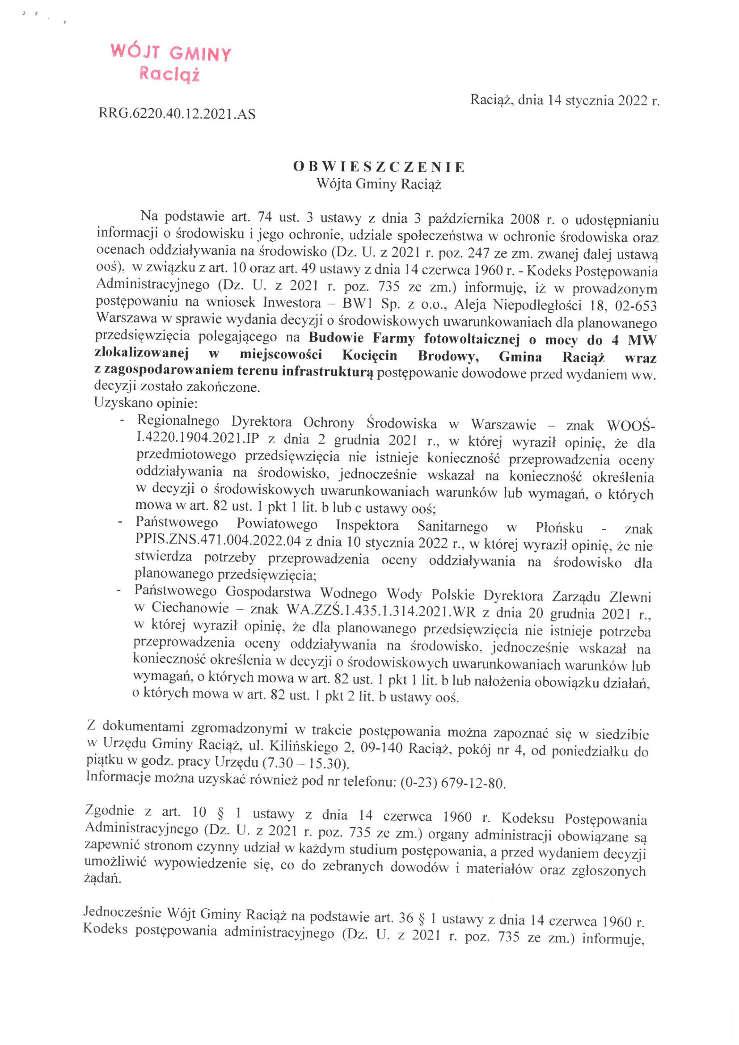 Budowa Farmy fotowoltaicznej o mocy do 4 MW zlokalizowanej w miejscowości Kocięcin Brodowy, Gmina Raciąż wraz z zagospodarowaniem terenu infrastrukturą
