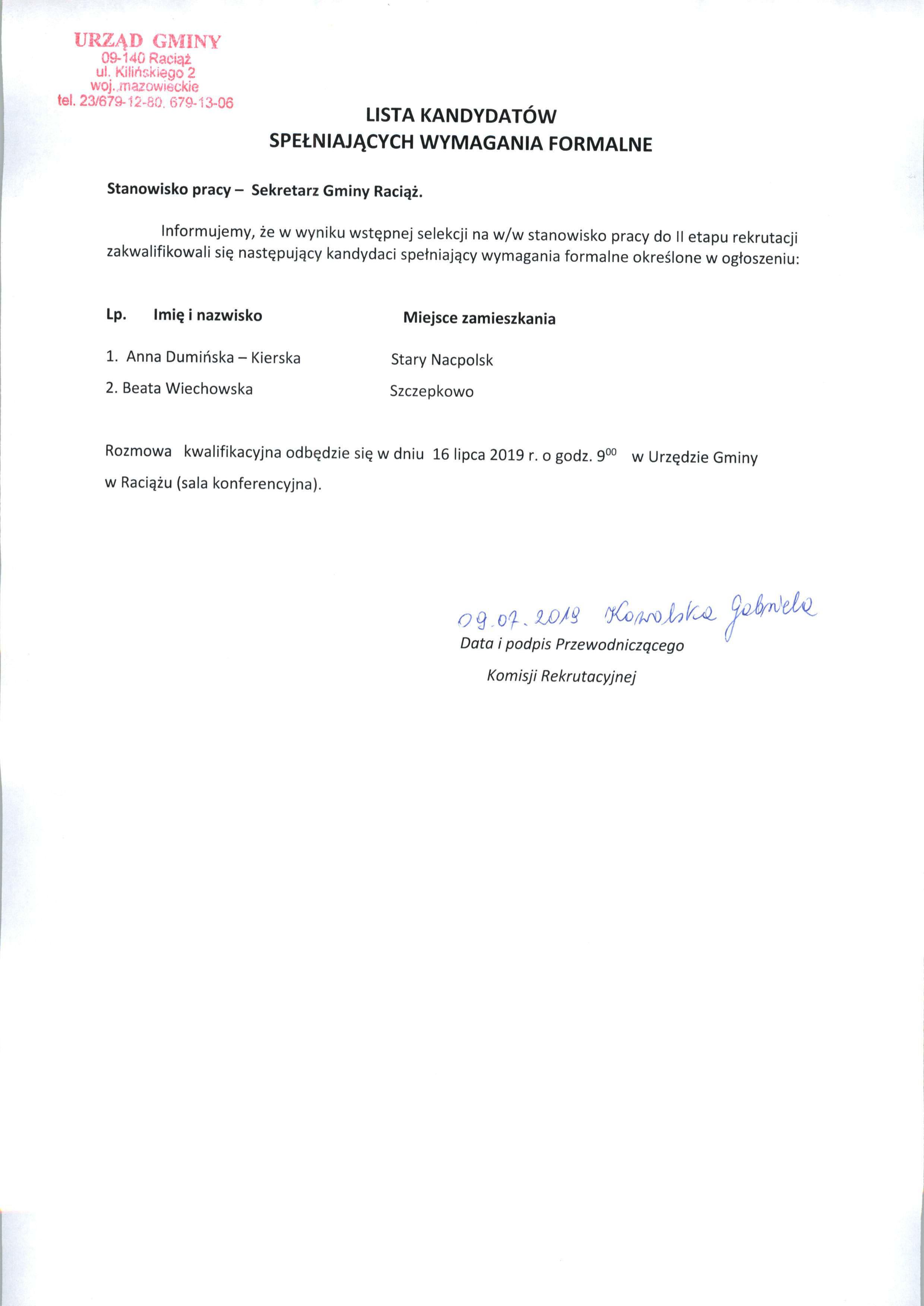 Lista kandydatów spełniających wymagania formalne. Stanowisko urzędnicze – Sekretarz Gminy Raciąż