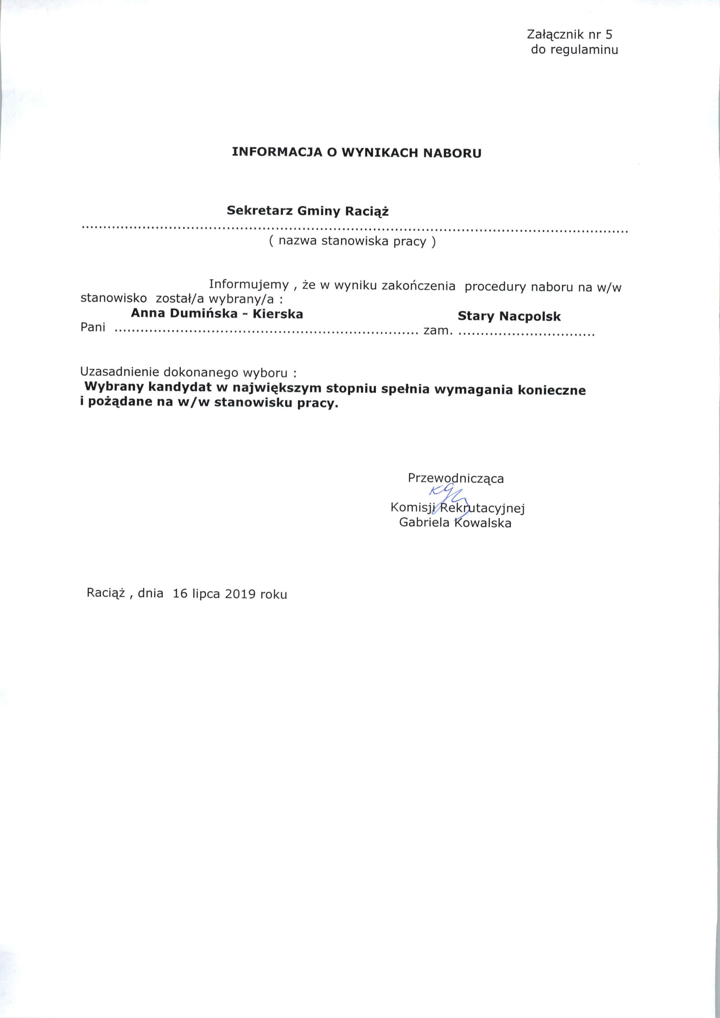 Informacja o wynikach naboru na wolne kierownicze stanowisko urzędnicze – Sekretarz Gminy Raciąż