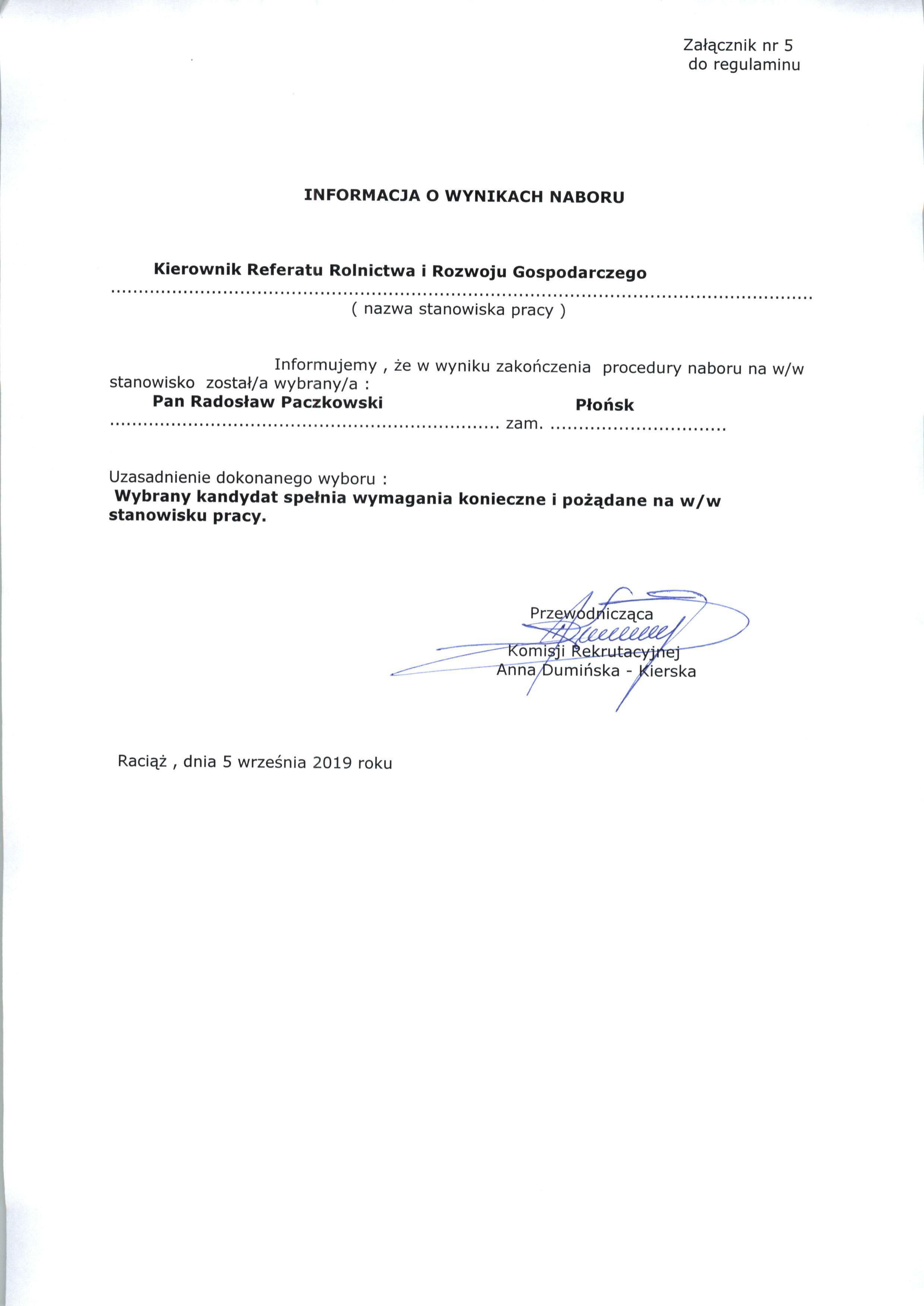 Informacja o wynikach naboru na wolne kierownicze stanowisko urzędnicze – Kierownik Referatu Rolnictwa i Rozwoju Gospodarczego w Urzędzie Gminy Raciąż