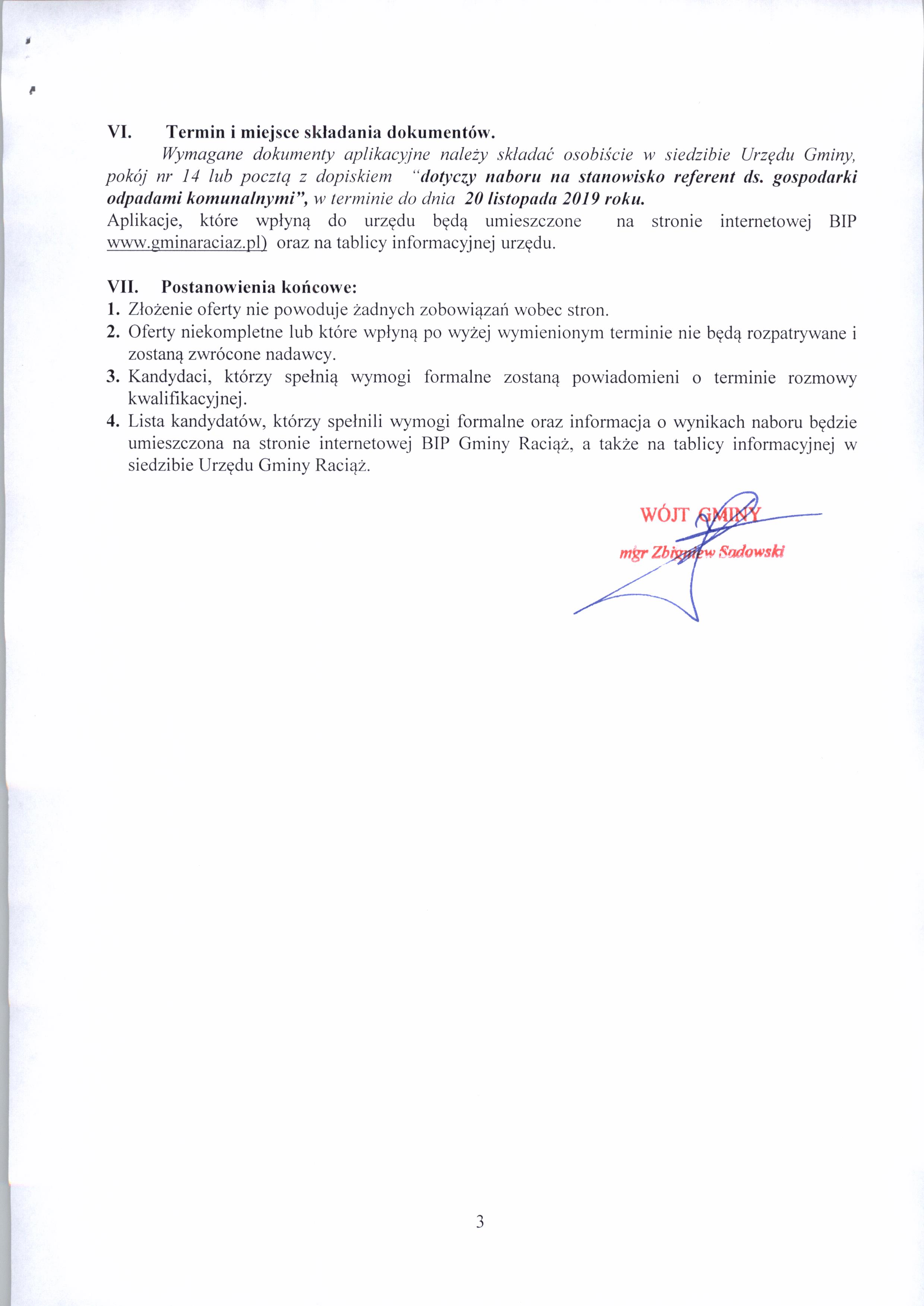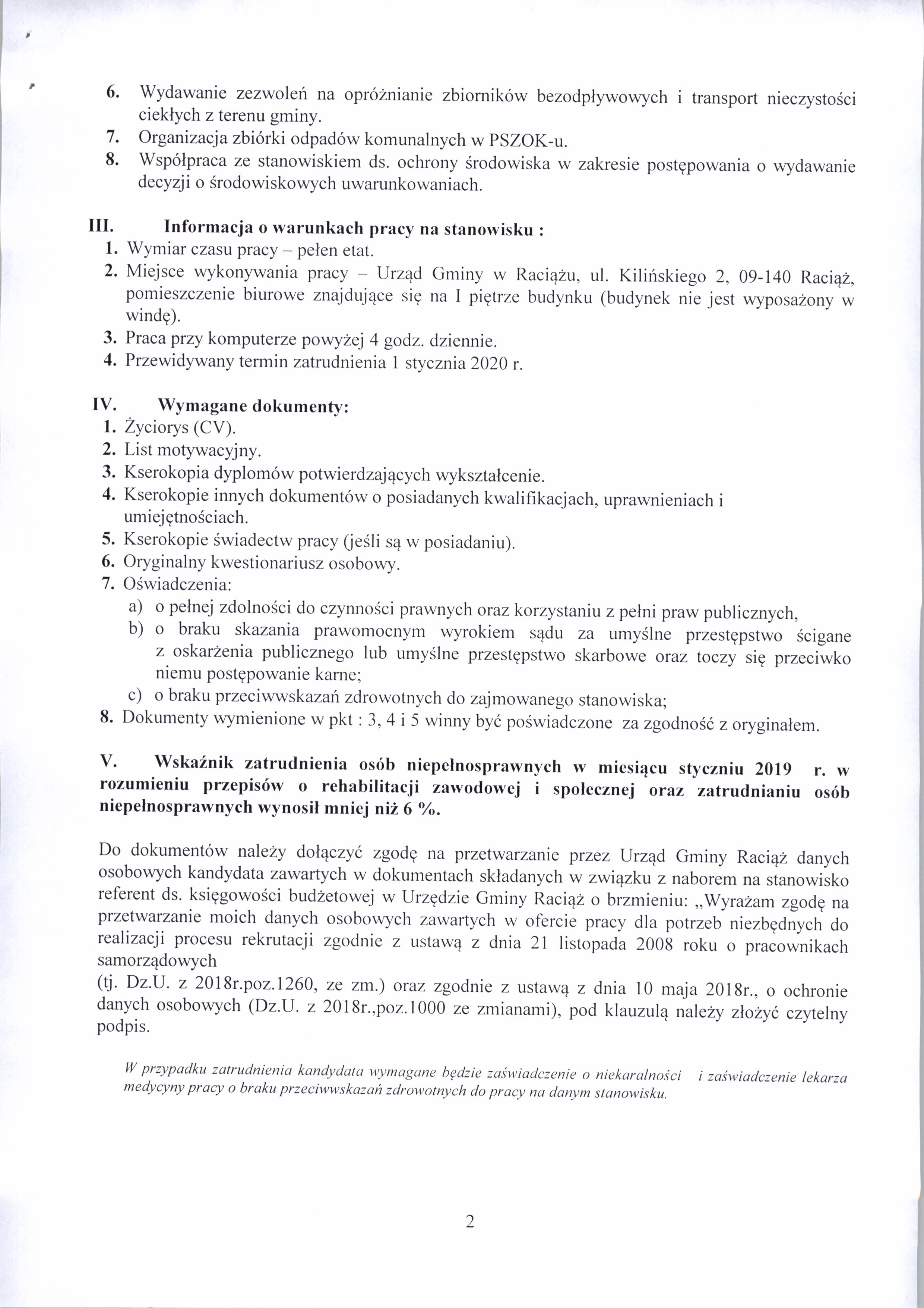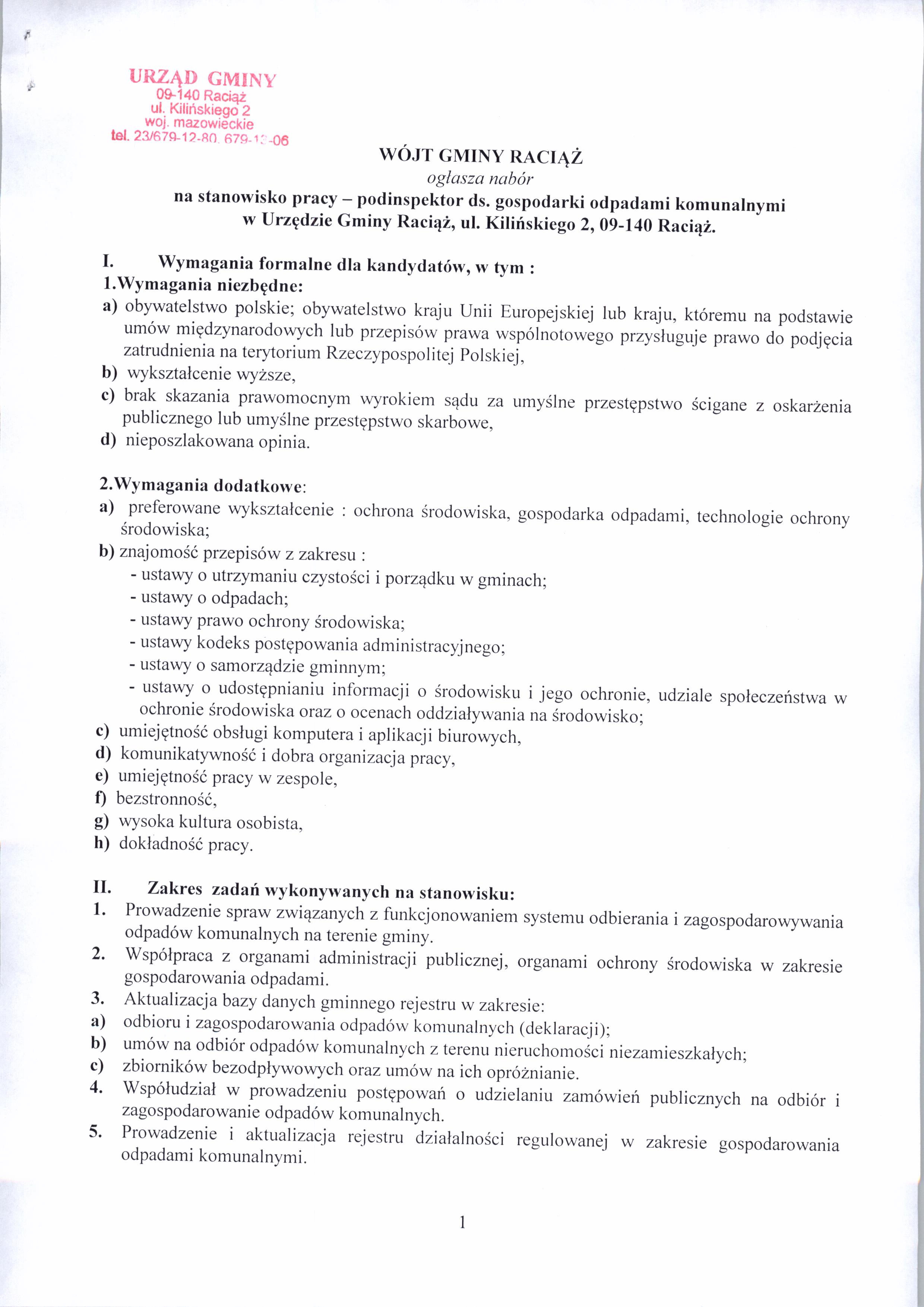Wójt Gminy Raciąż ogłasza nabór na stanowisko pracy – podinspektor ds. gospodarki odpadami komunalnymi w Urzędzie Gminy Raciąż