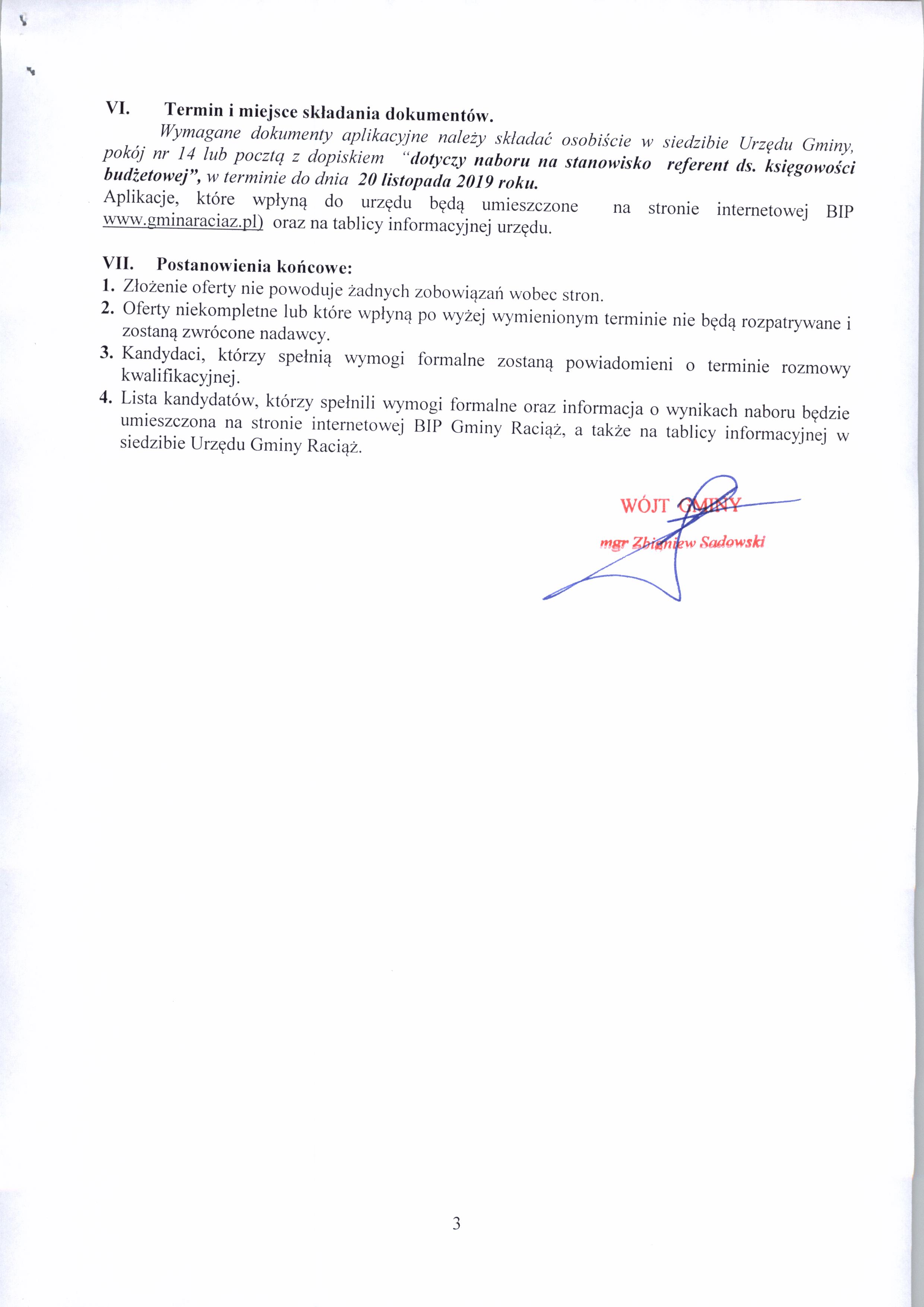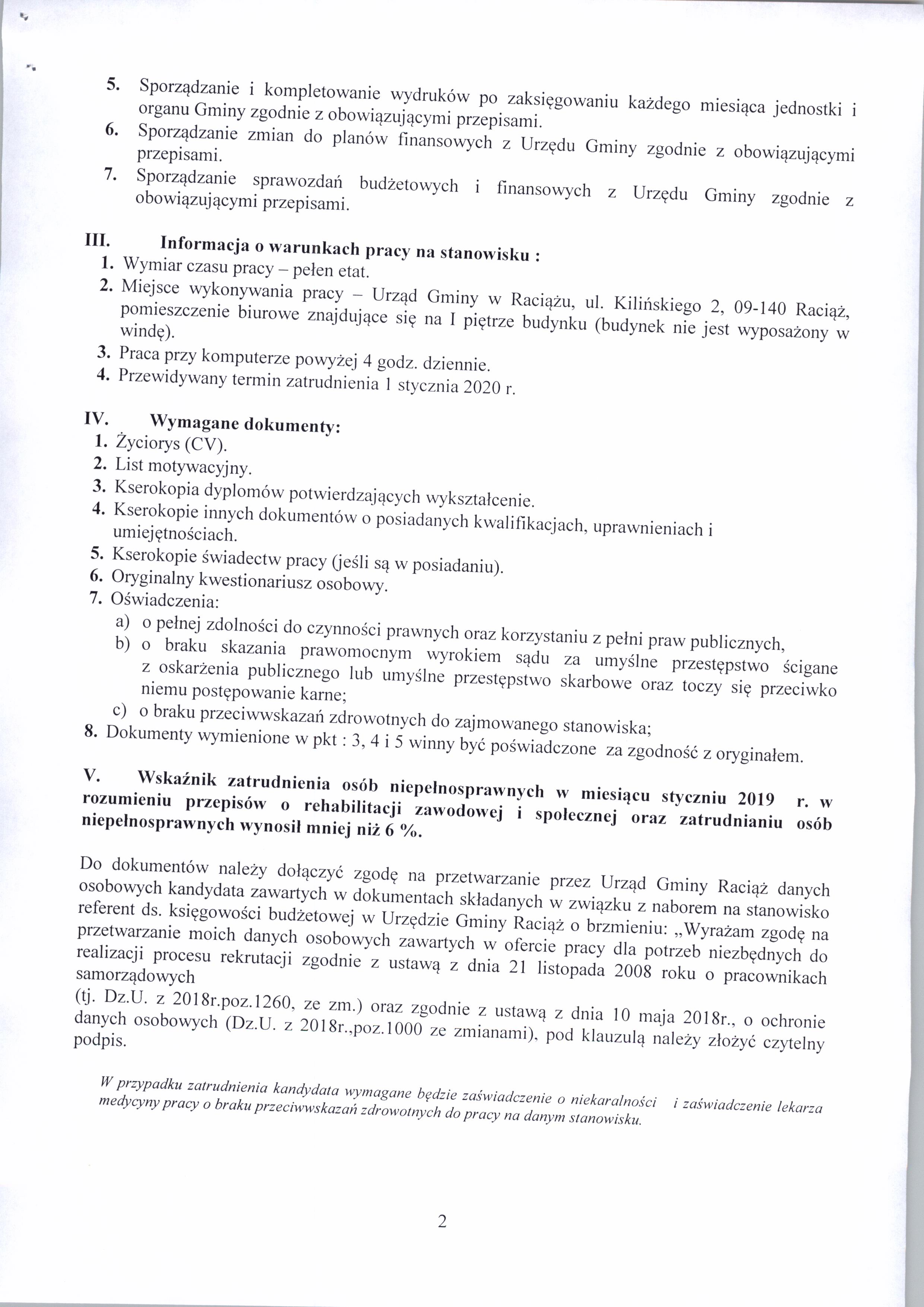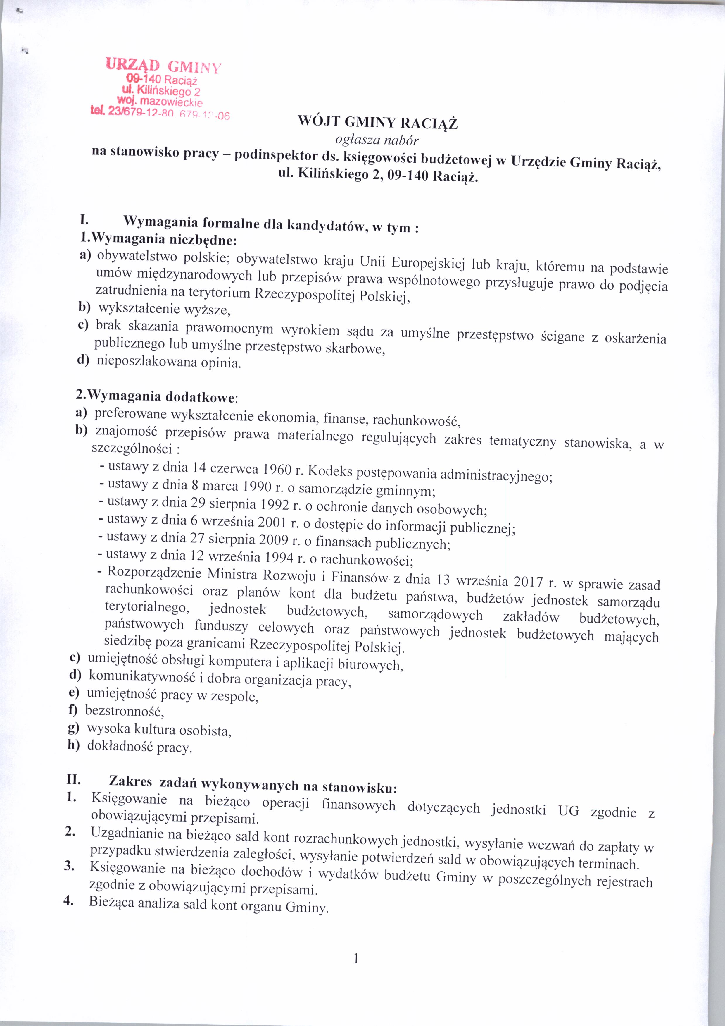 Wójt Gminy Raciąż ogłasza nabór na stanowisko pracy – podinspektor ds. księgowości budżetowej w Urzędzie Gminy Raciąż