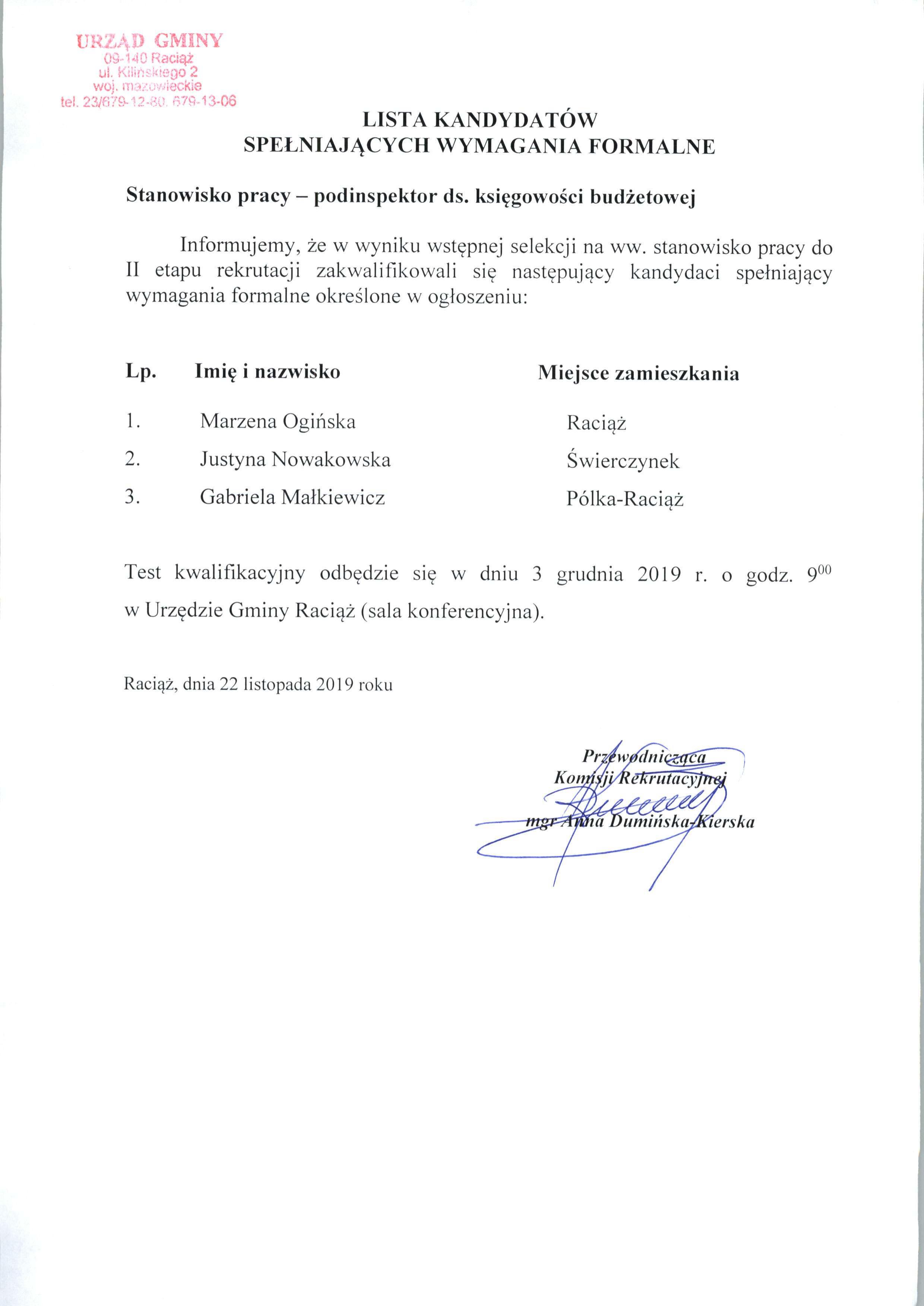 Lista kandydatów spełniających wymagania formalne. Stanowisko urzędnicze - podinspektor ds. księgowości budżetowej w Urzędzie Gminy Raciąż