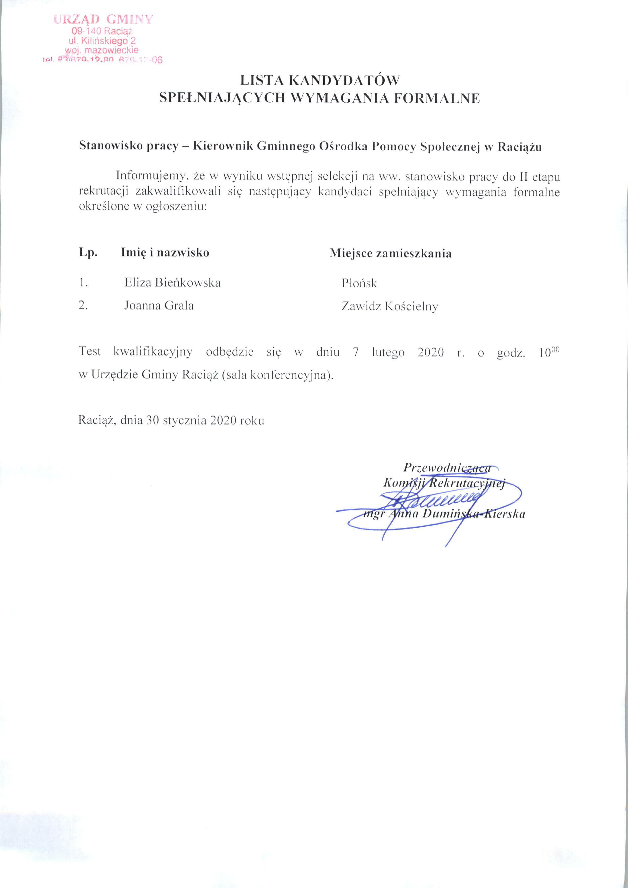Lista kandydatów spełniających wymagania formalne. Stanowisko kierownika Gminnego Ośrodka Pomocy Społecznej w Raciążu
