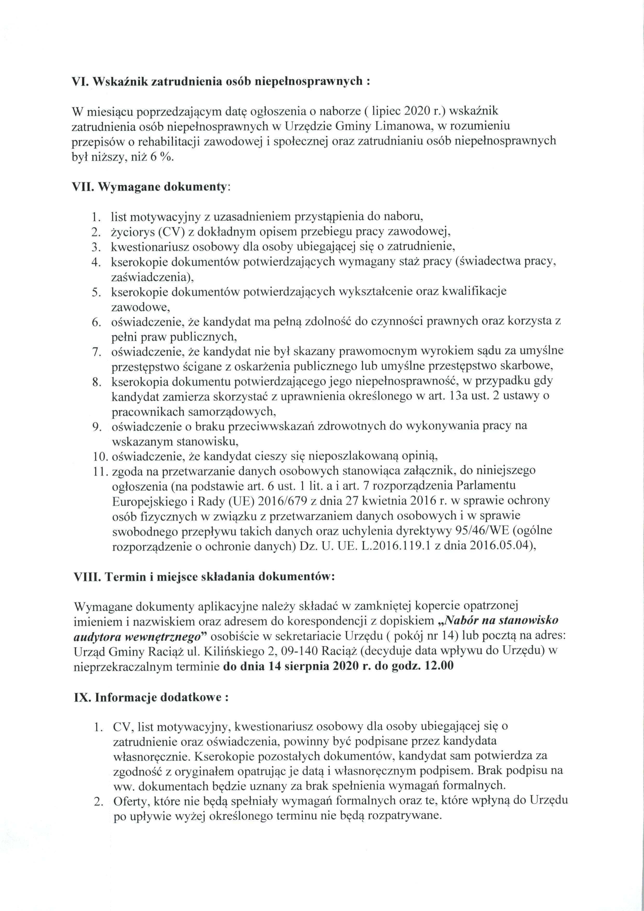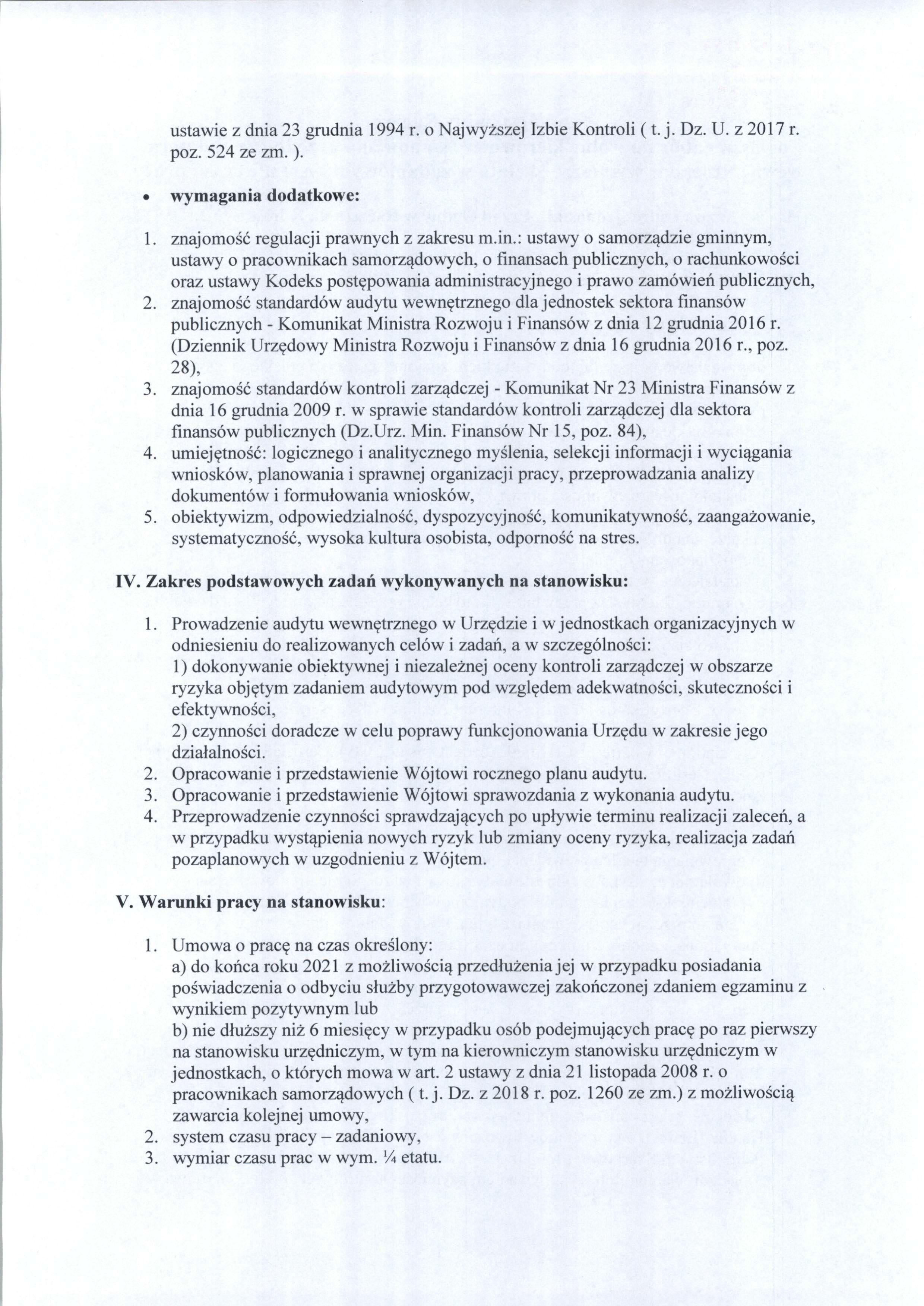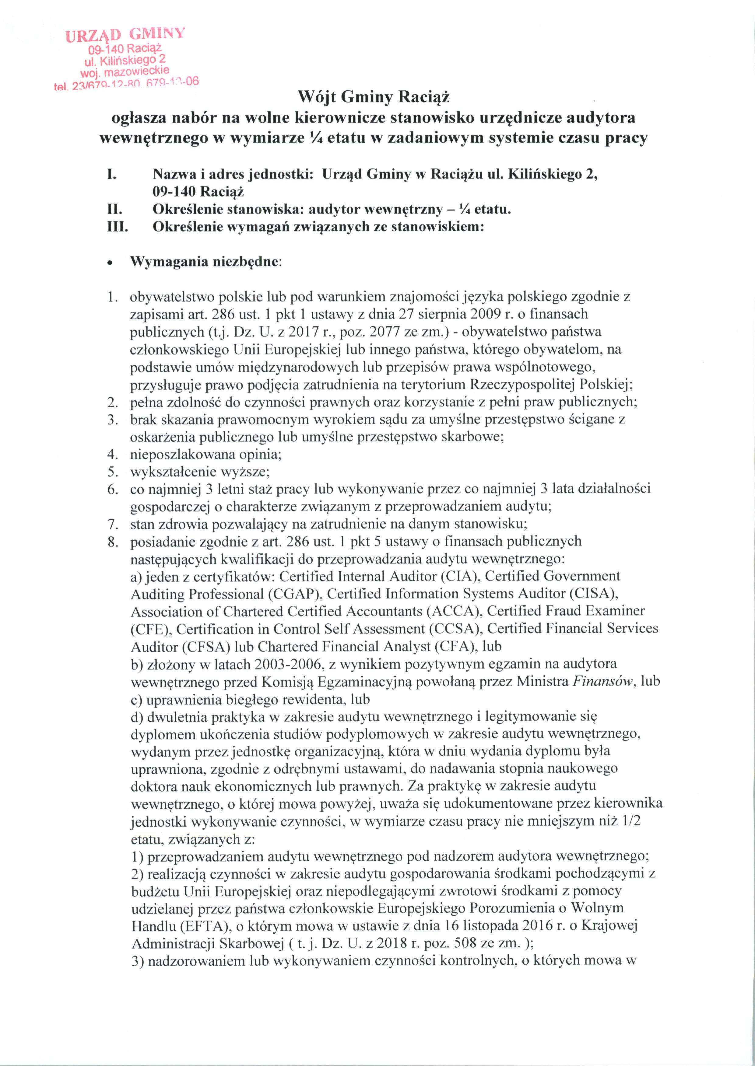 Wójt Gminy Raciąż ogłasza nabór na wolne kierownicze stanowisko urzędnicze audytora wewnętrznego w wymiarze 1/4 etatu w zadaniowym systemie pracy