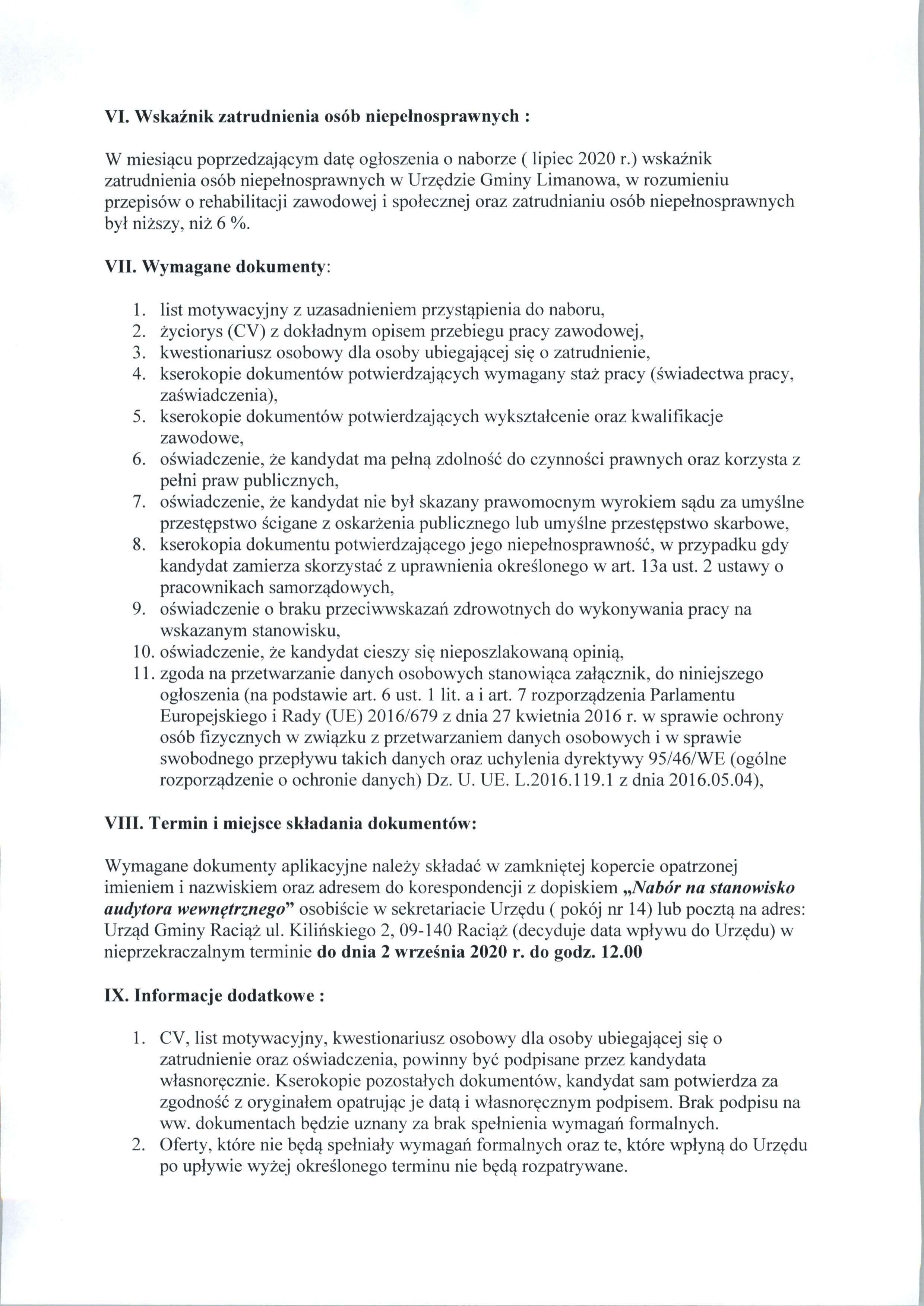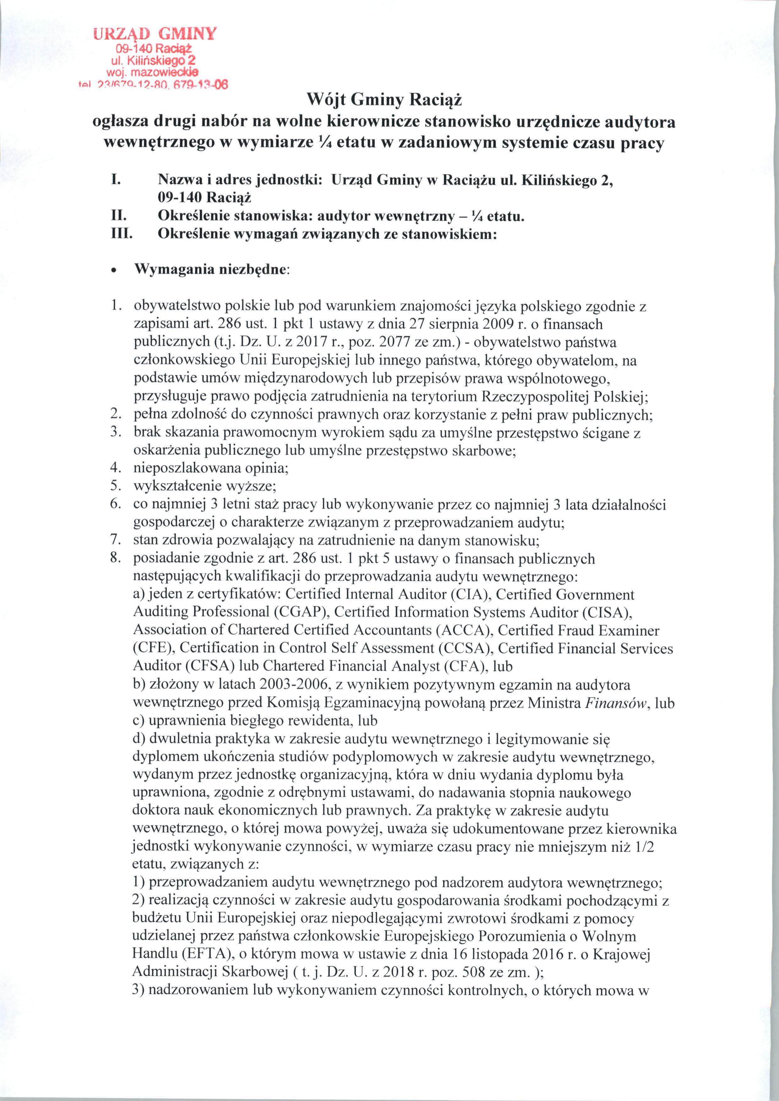 Wójt Gminy Raciąż ogłasza drugi nabór na wolne kierownicze stanowisko urzędnicze audytora wewnętrznego w wymiarze 1/4 etatu w zadaniowym systemie pracy