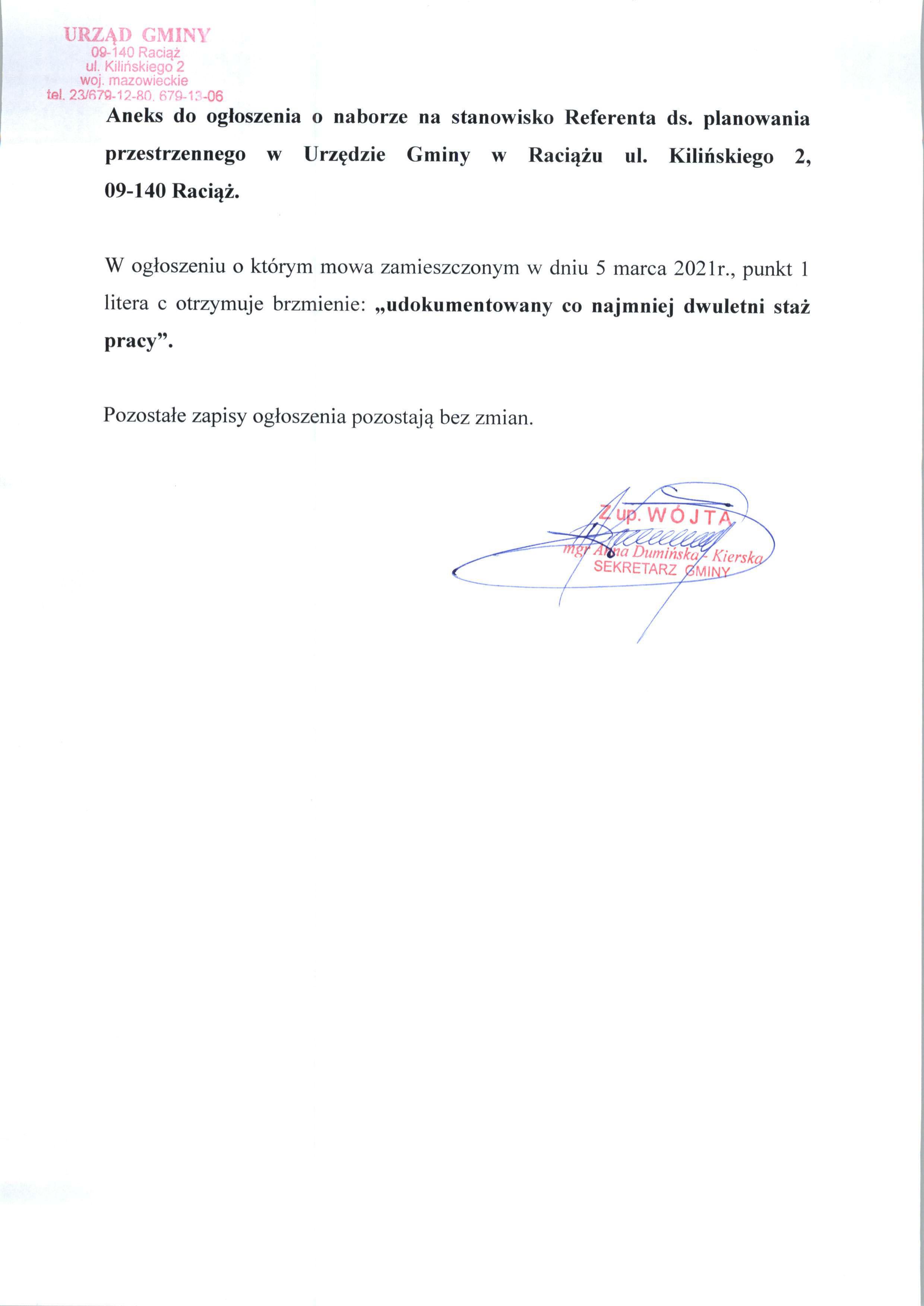 Aneks do ogłoszenia o naborze na stanowisko Referenta ds. planowania przestrzennego w Urzędzie Gminy w Raciążu ul. Kilińskiego 2, 09-140 Raciąż.
