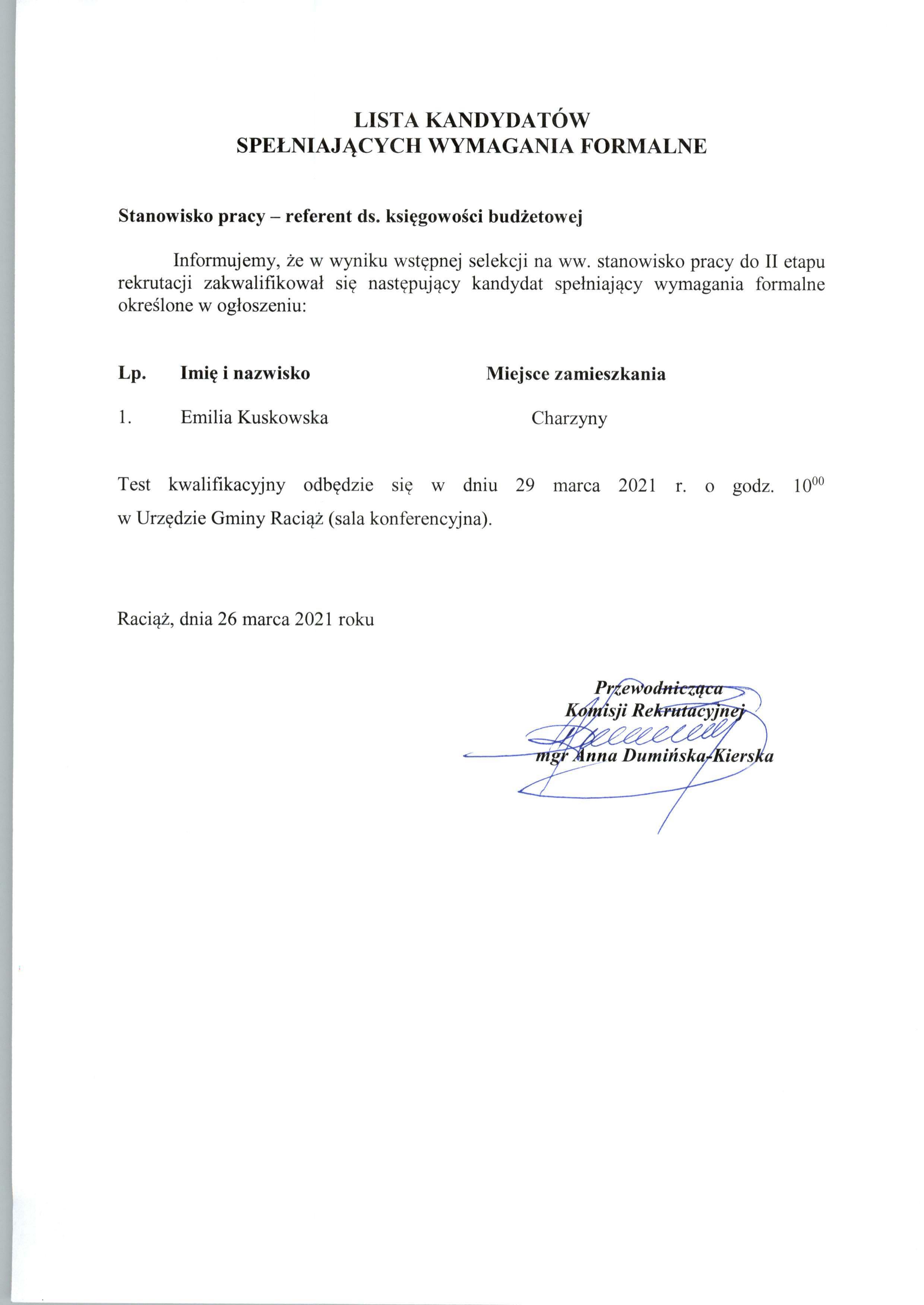 Lista kandydatów spełniających wymagania formalne. Stanowisko pracy - referent ds. księgowości budżetowej w Urzędzie Gminy Raciąż