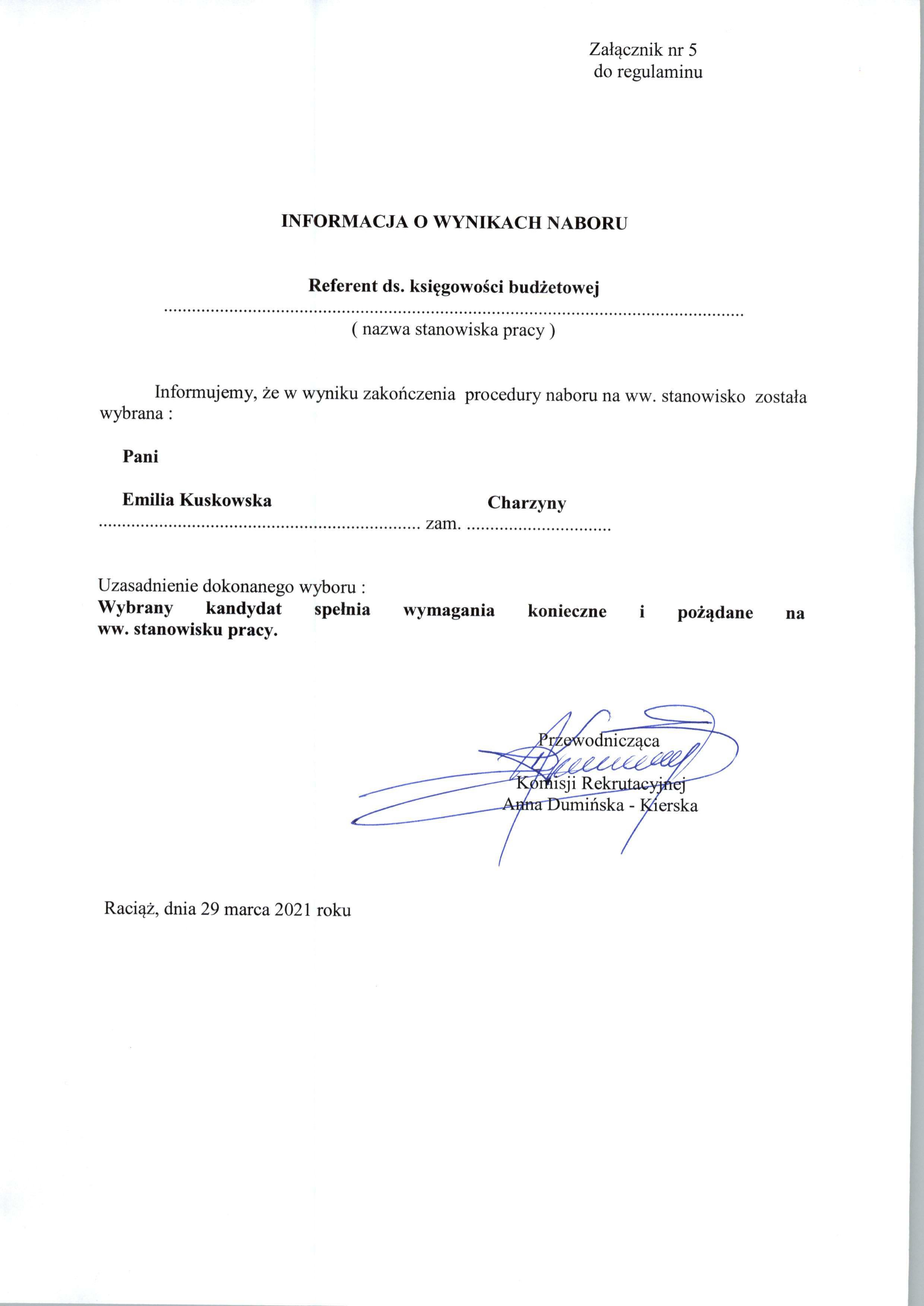 Informacja o wynikach naboru na stanowisko referent ds. księgowości budżetowej w Urzędzie Gminy Raciąż
