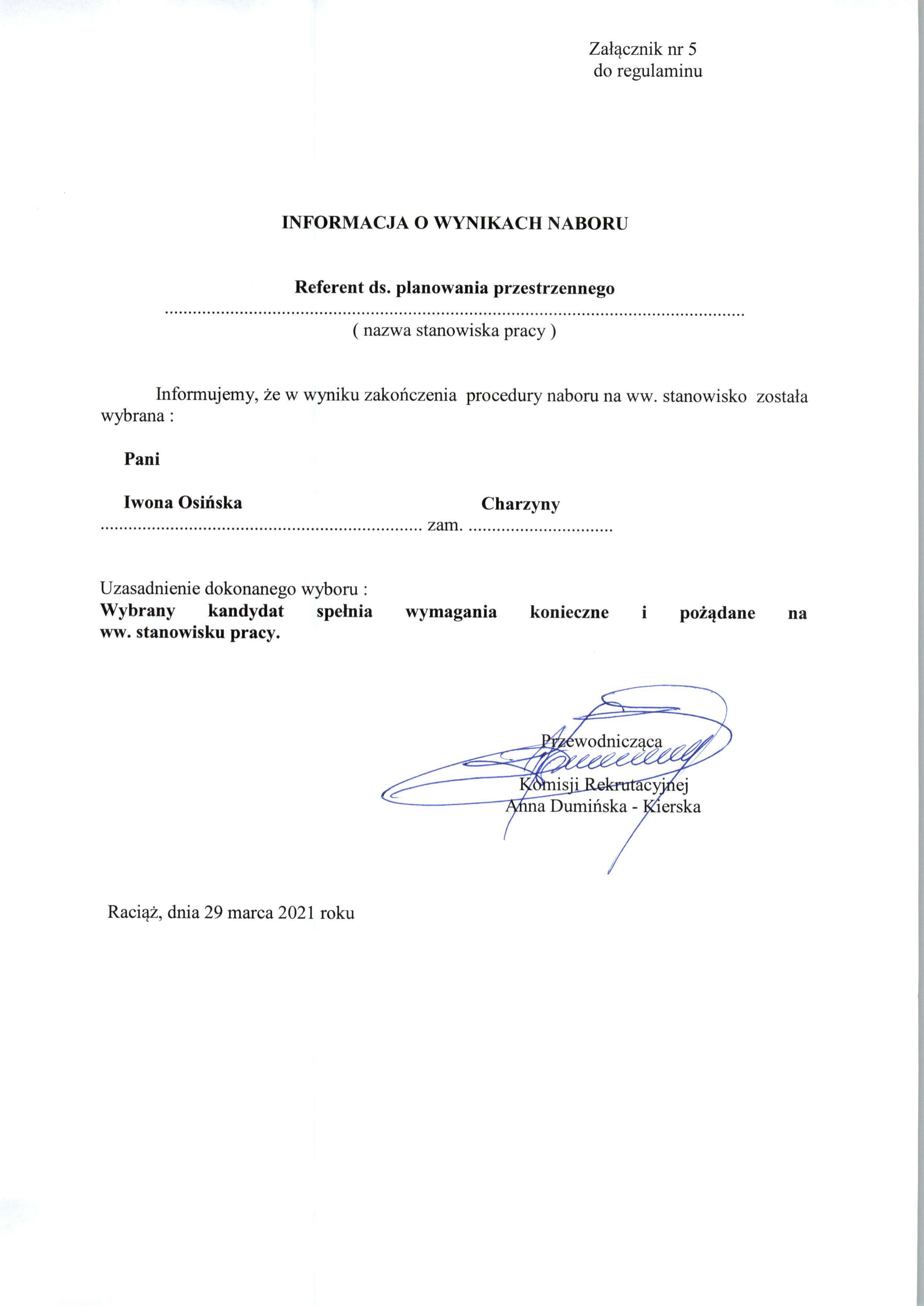 Informacja o wynikach naboru na stanowisko referenta ds. planowania przestrzennego w Urzędzie Gminy Raciąż