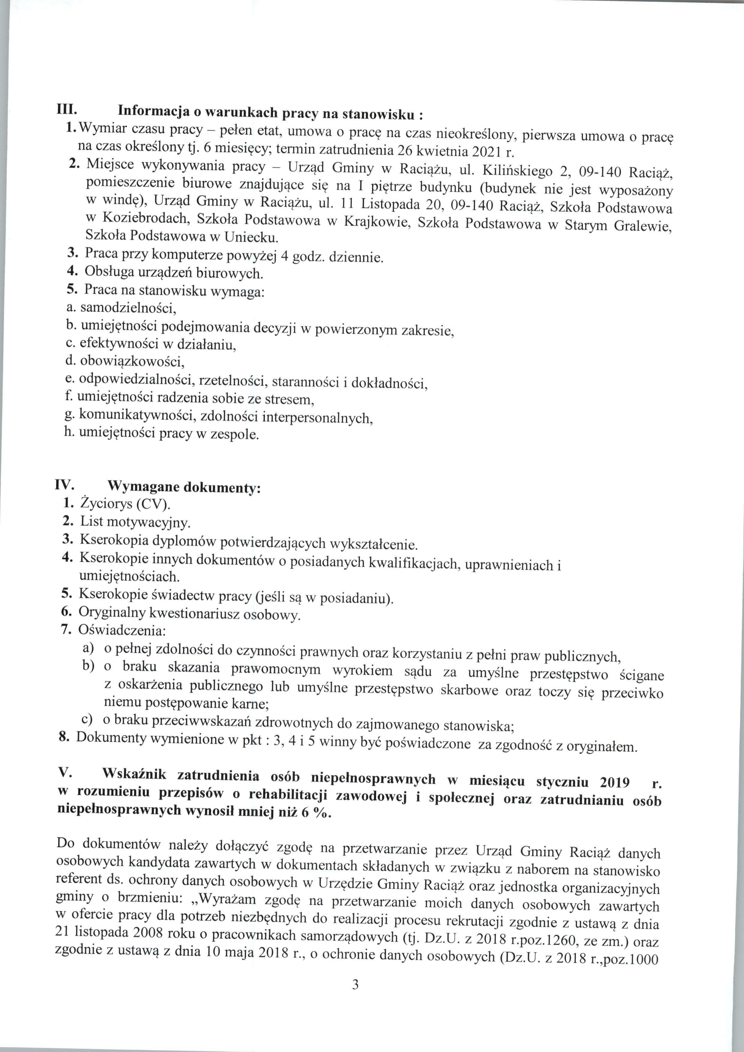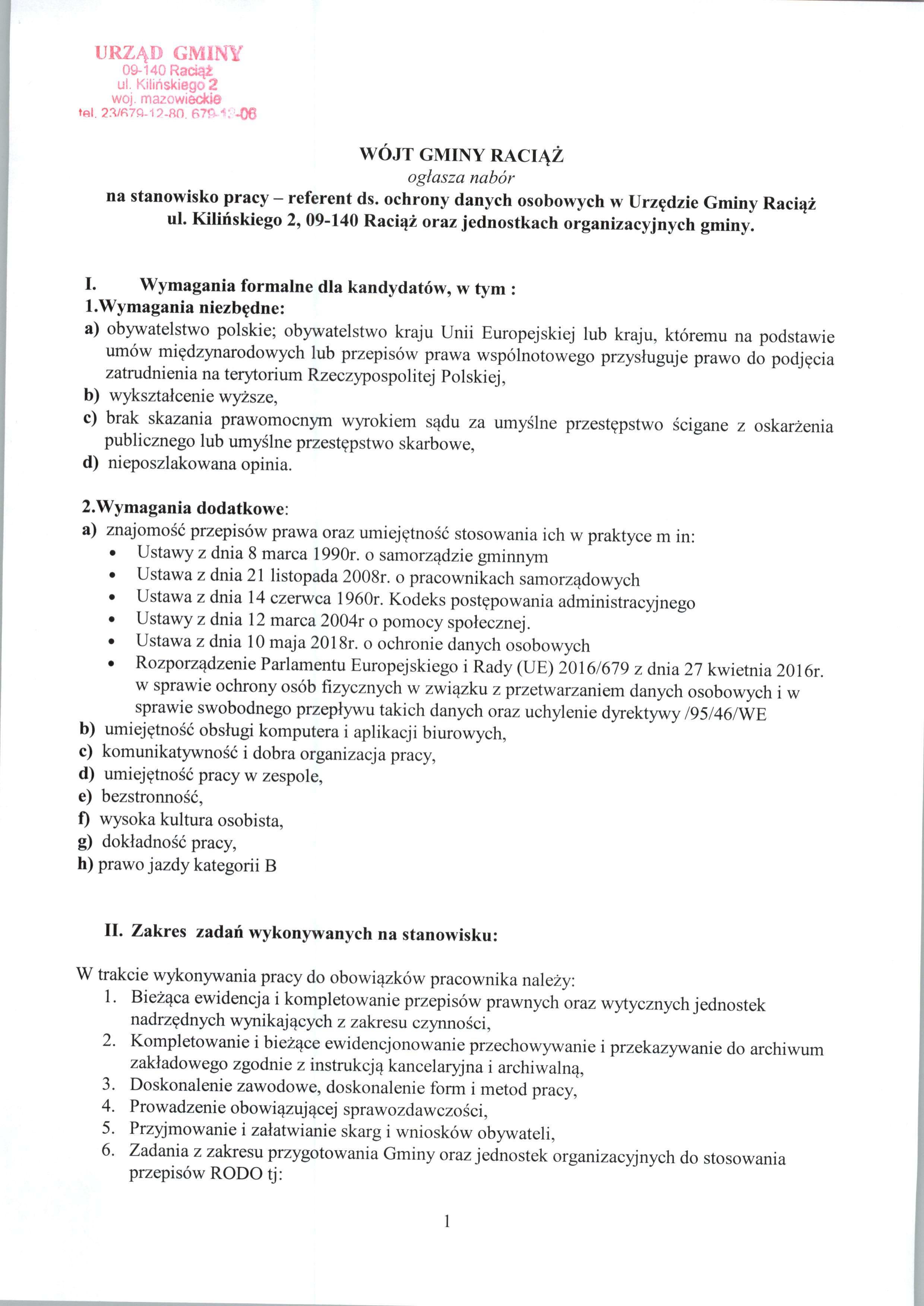 Wójt Gminy Raciąż ogłasza nabór na stanowisko pracy – referent ds. ochrony danych osobowych w Urzędzie Gminy Raciąż ul. Kilińskiego 2, 09-140 Raciąż oraz jednostkach organizacyjnych gminy.