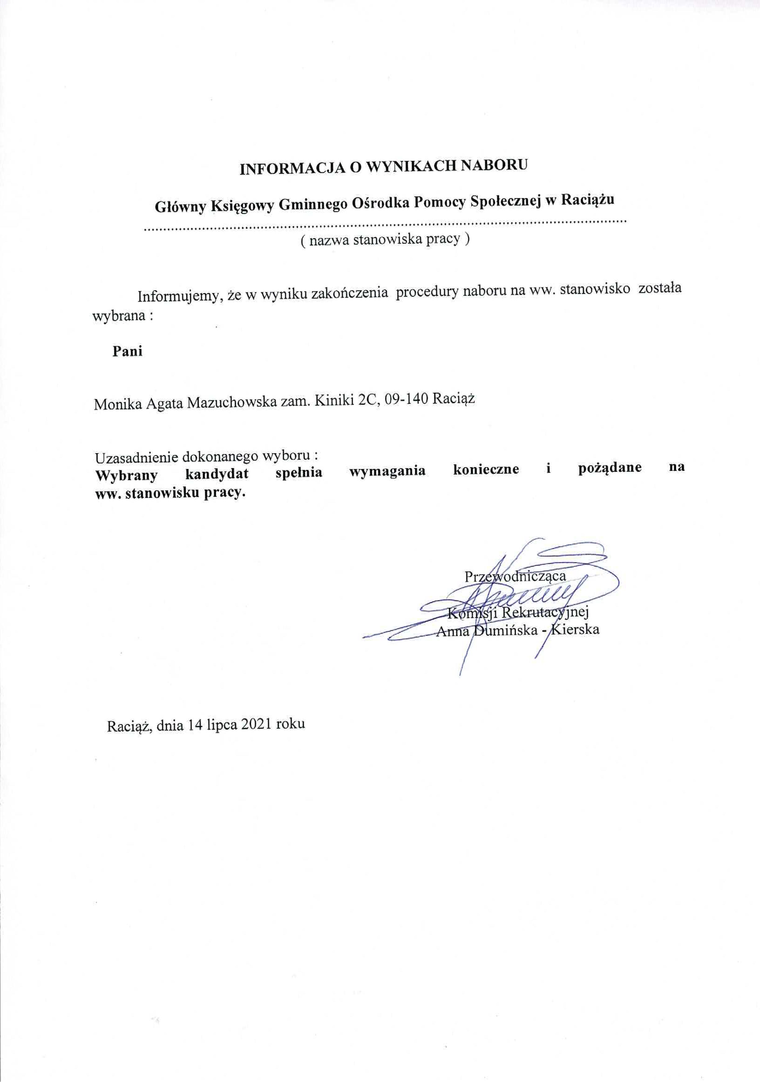 INFORMACJA O WYNIKACH NABORU NA WOLNE STANOWISKO URZĘDNICZE GŁÓWNY KSIĘGOWY