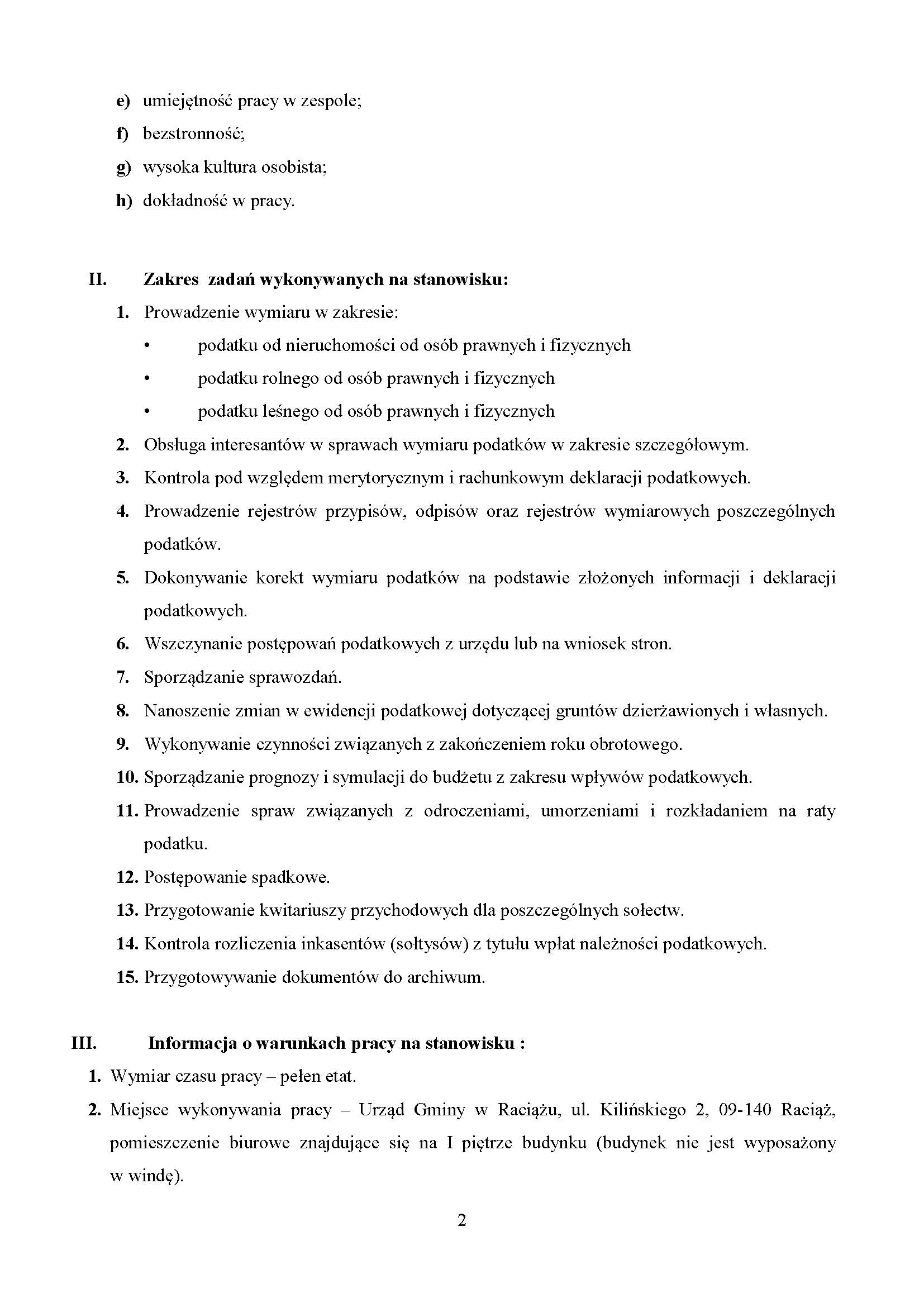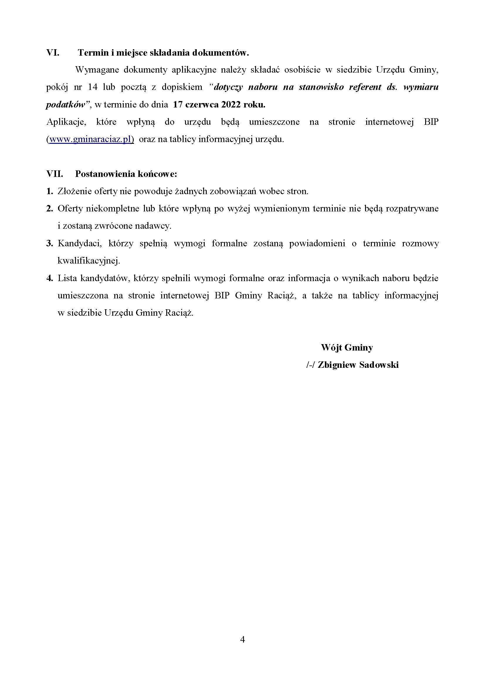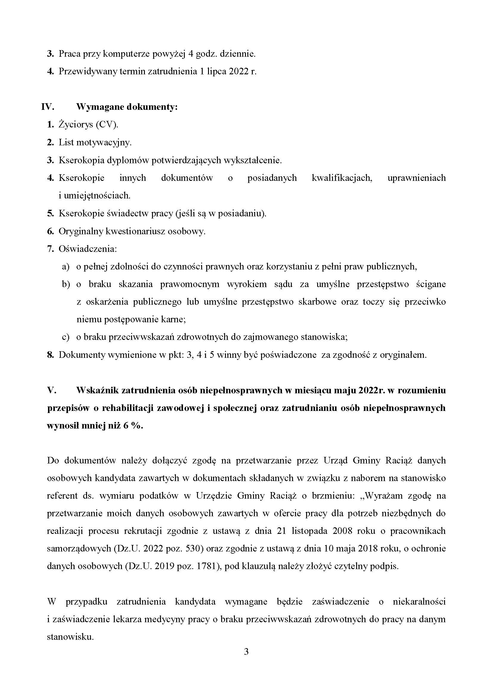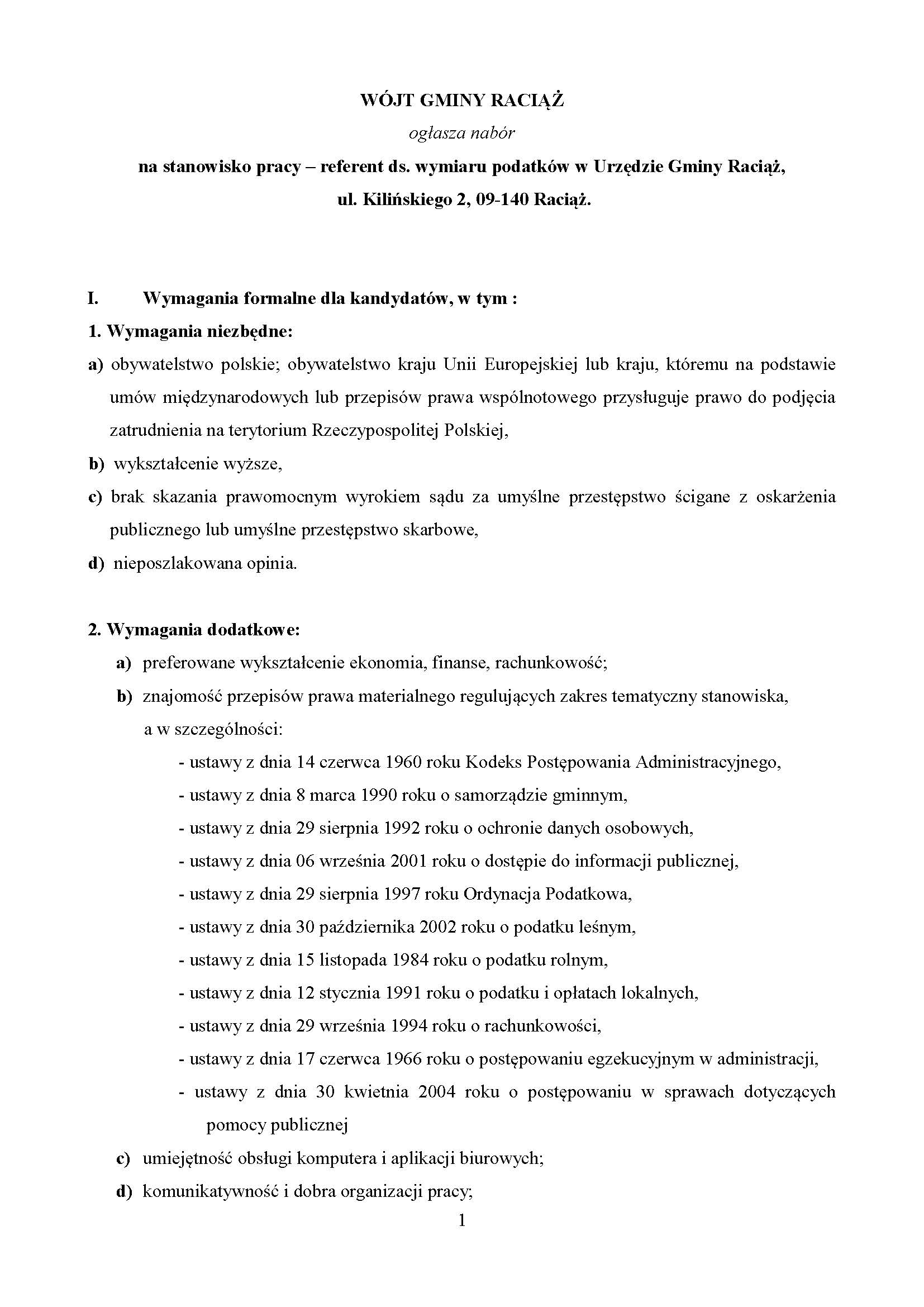 WÓJT GMINY RACIĄŻ ogłasza nabór na stanowisko pracy – referent ds. wymiaru podatków w Urzędzie Gminy Raciąż