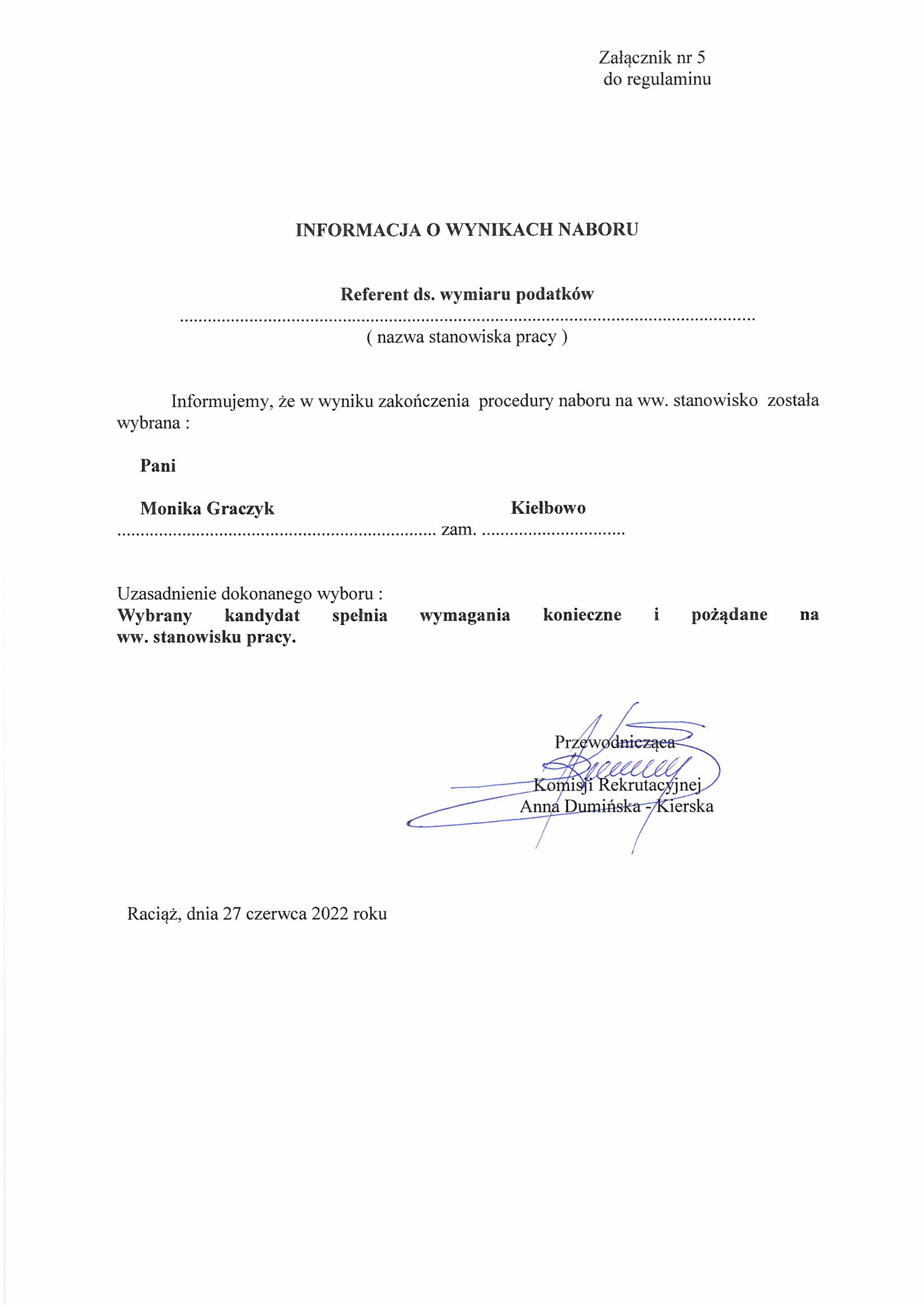 NFORMACJA O WYNIKACH NABORU Referent ds. wymiaru podatków