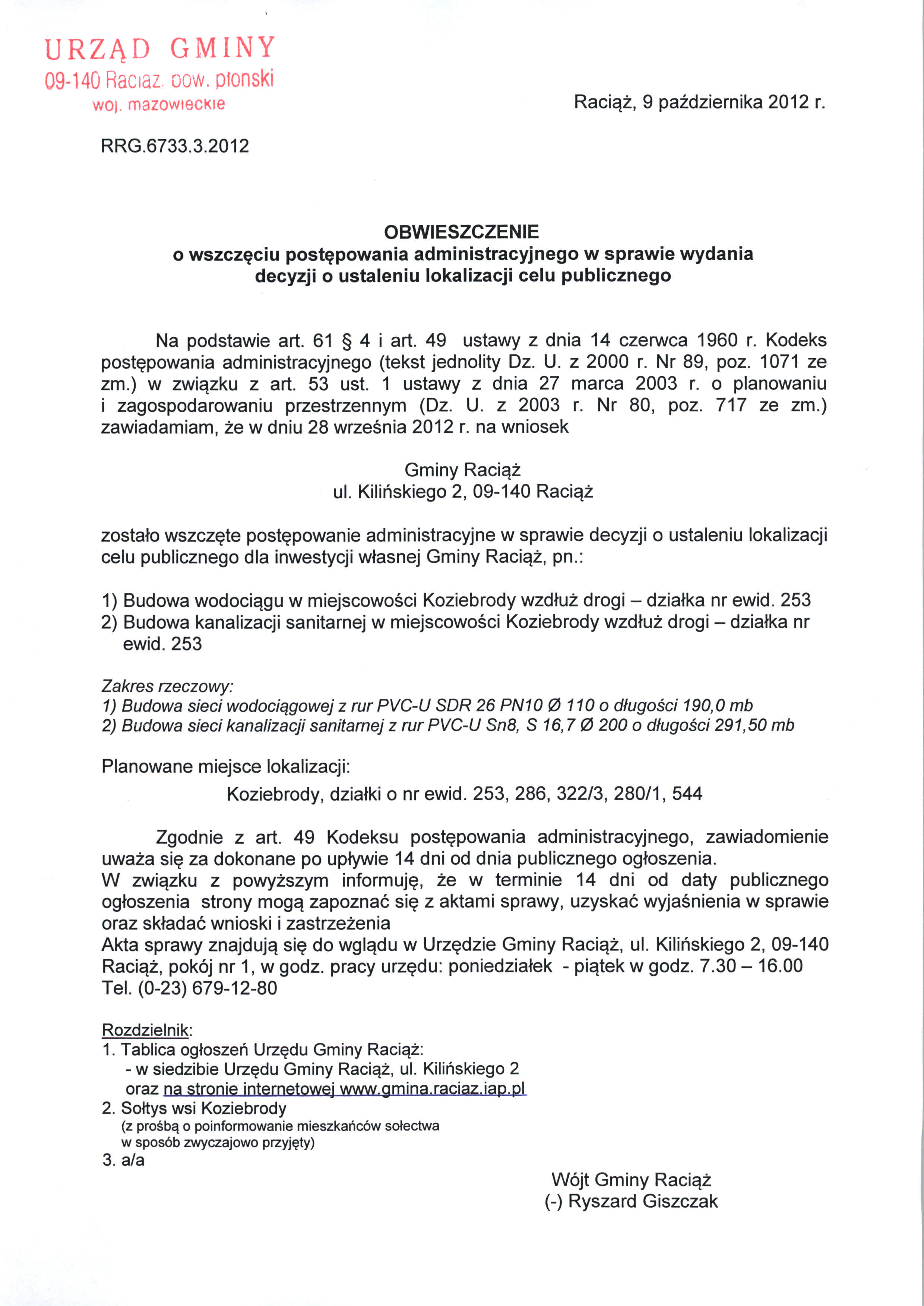 Obwieszczenie o wszczęciu postępowania adminitracyjnego w sprawie wydania decyzji o ustaleniu lokalizacji celu publicznego