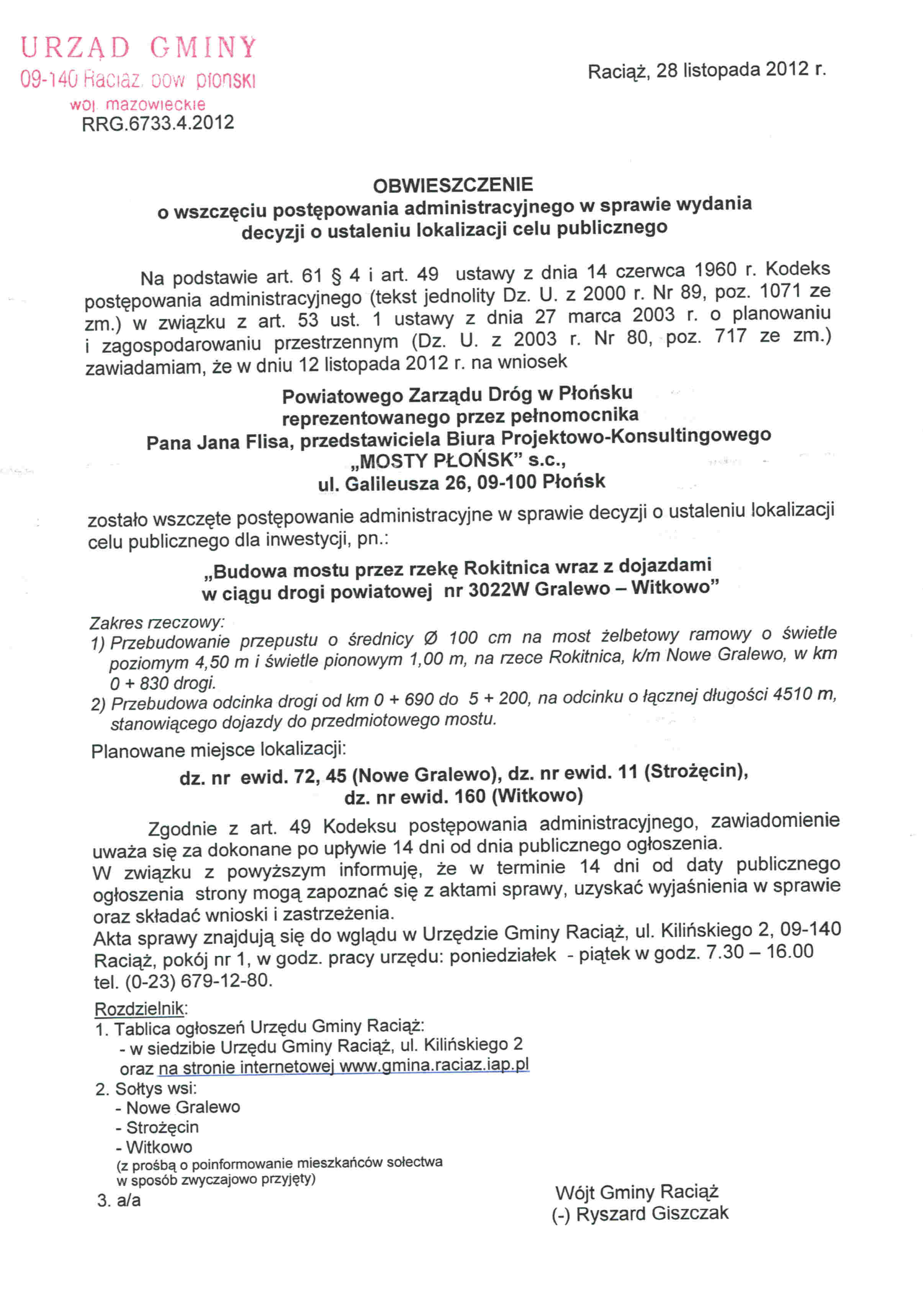 Obwieszczenie o wszczęciu postępowania administr. w sprawie wydania decyzji o ustaleniu lokalizacji celu publicznego - Obwieszczenia - Bip Gmina Raciąż