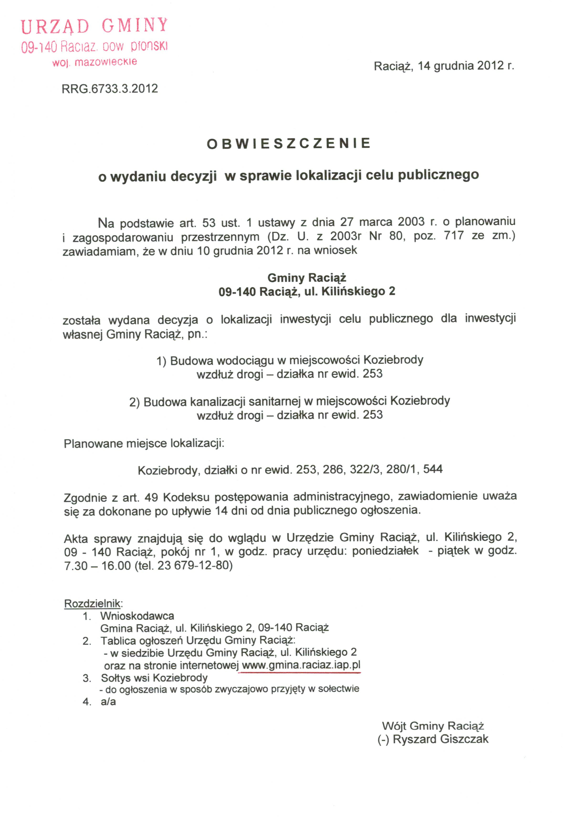 Obwieszczenie o wydaniu decyzji w sprawie lokalizacji celu publicznego - Obwieszczenia - Bip Gmina Raciąż