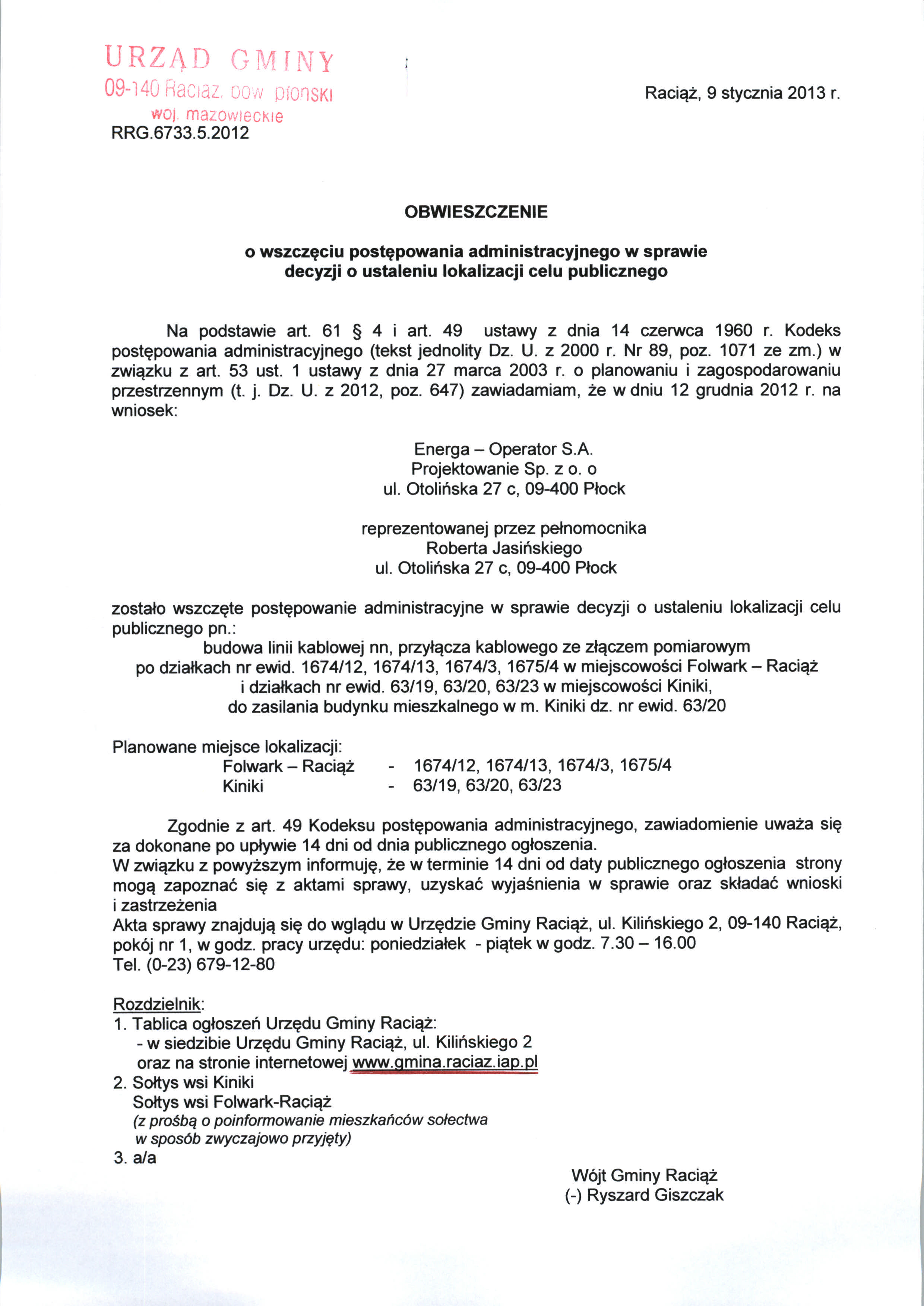 Obwieszczenie o wszczęciu postepowania administrtacyjnego w sprawie decyzji o ustaleniu lokalizacji celu publicznego - Obwieszczenia - Bip Gmina Raciąż