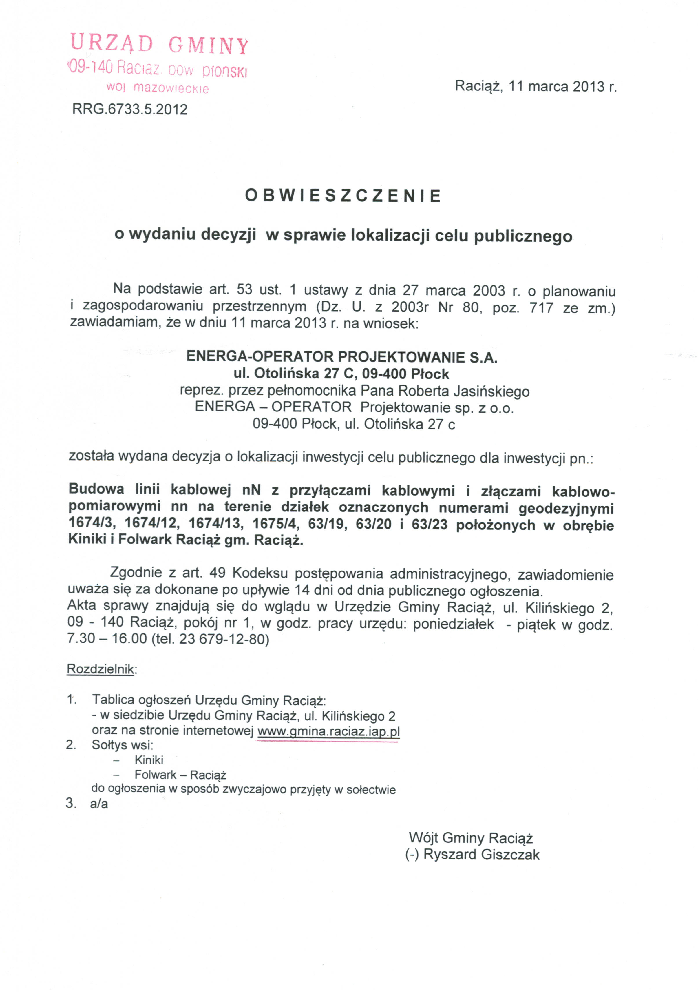 Obwieszczenie o wydaniu decyzji w sprawie lokalizacji celu publicznego - Obwieszczenia - Bip Gmina Raciąż