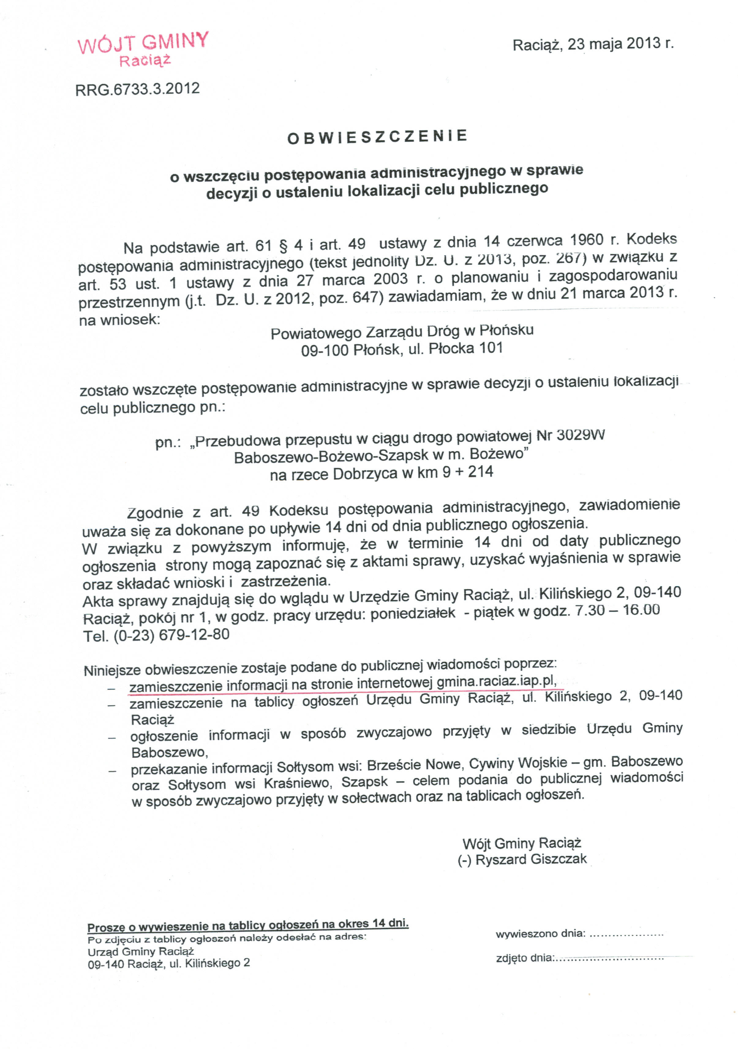Obwieszczenie o wszczęciu postępowania administracyjnego w sprawie decyzji o ustaleniu lokalizacji celu publicznego - Obwieszczenia - Bip Gmina Raciąż