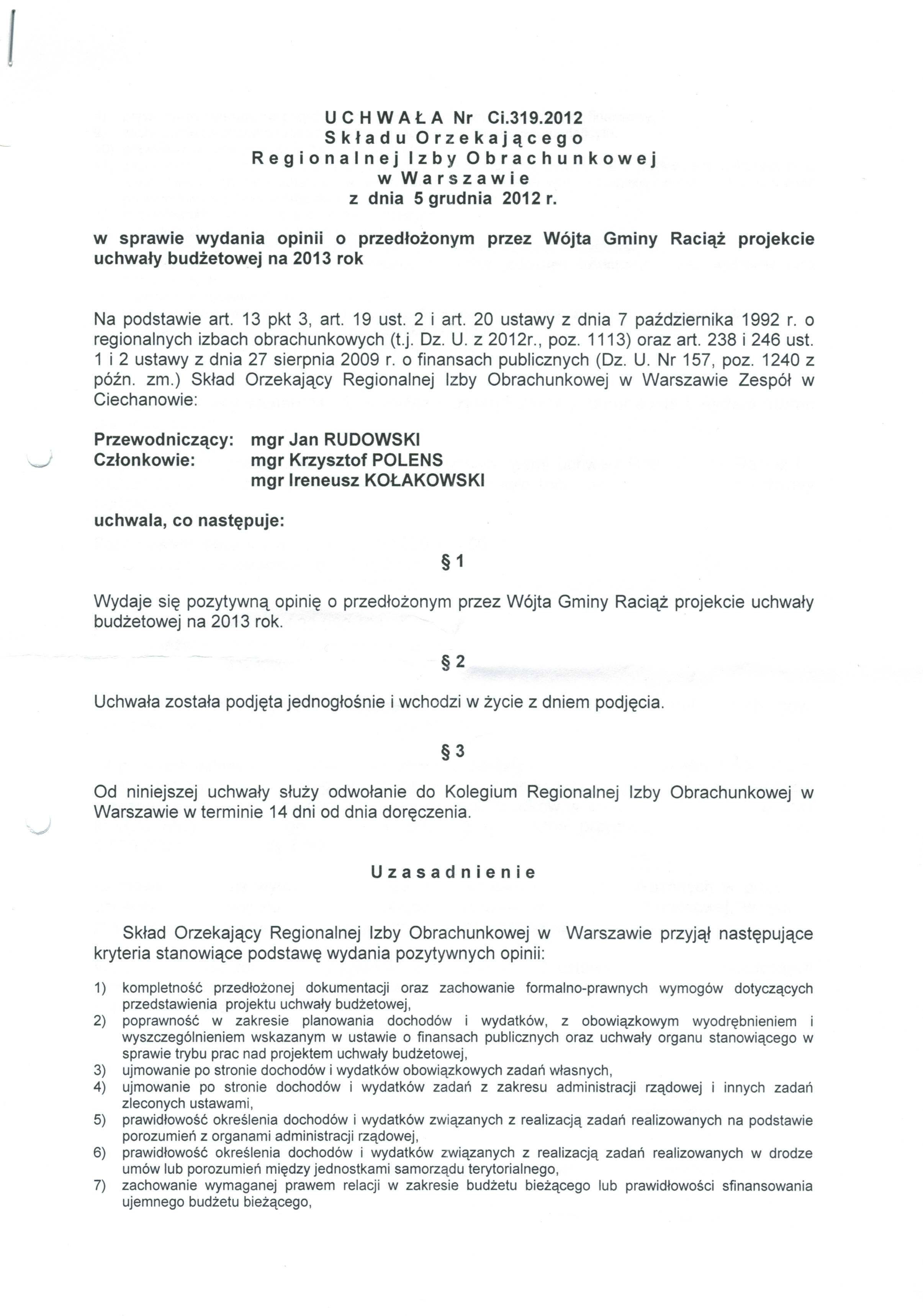 Uchwała Nr Ci.319.2012 Składu Orzekającego RIO w Warszawie z dn. 5.12.2012r. - Uchwały 2012 - Bip Gmina Raciąż