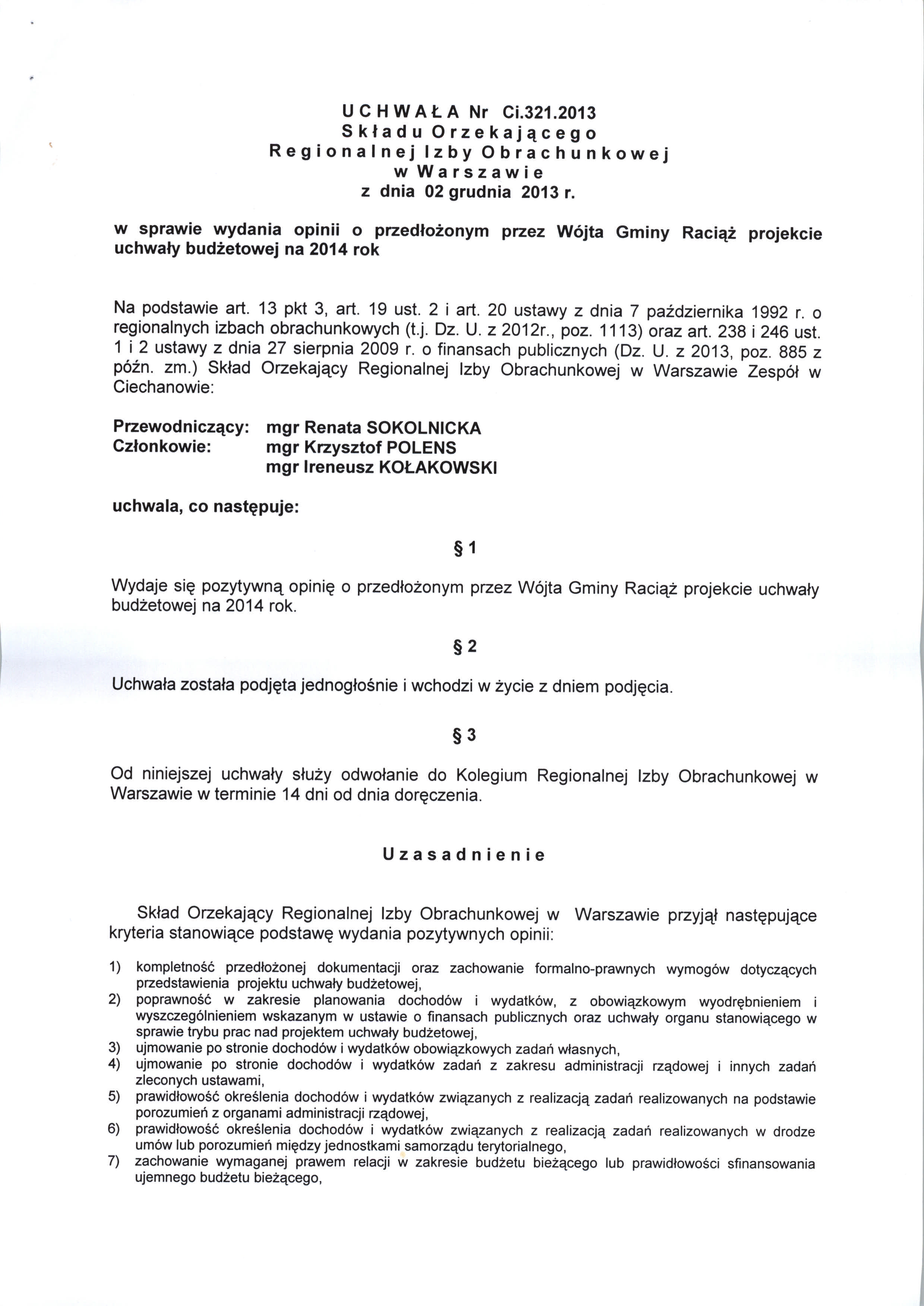 Uchwała Nr Ci.321.2013 Składu Orzekającego Regionalnej Izby Obrachunkowej w Warszawie - Uchwały 2013 - Bip Gmina Raciąż