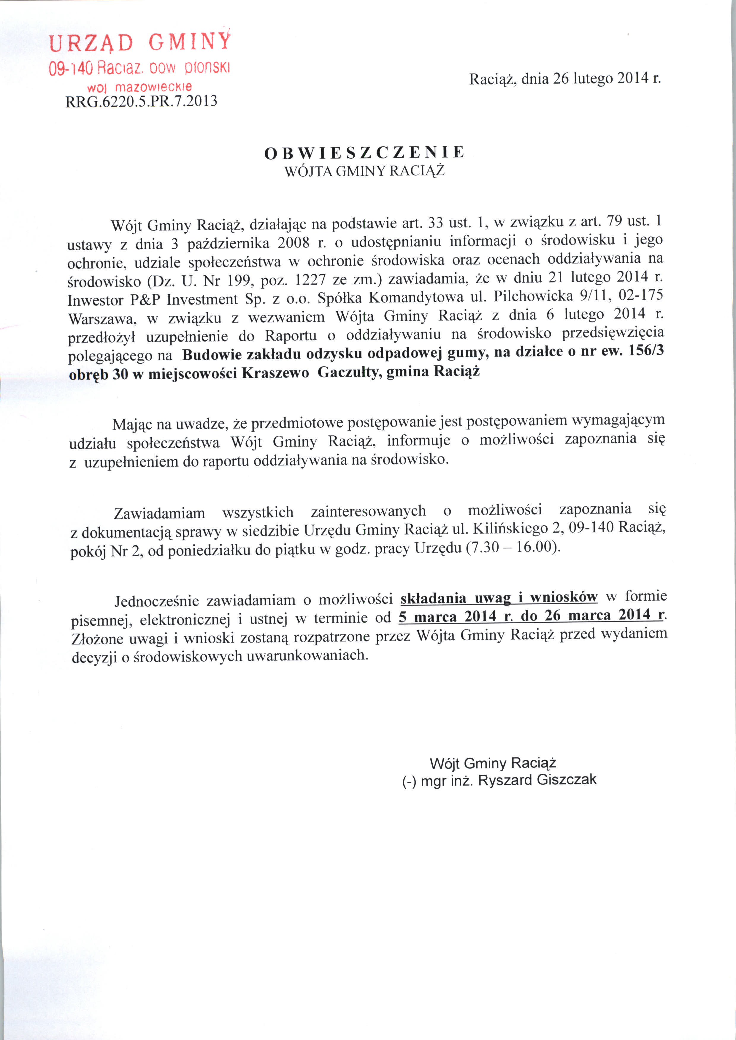 Obwieszczenie Wójta Gminy Raciąż - Obwieszczenia 2014 - Bip Gmina Raciąż