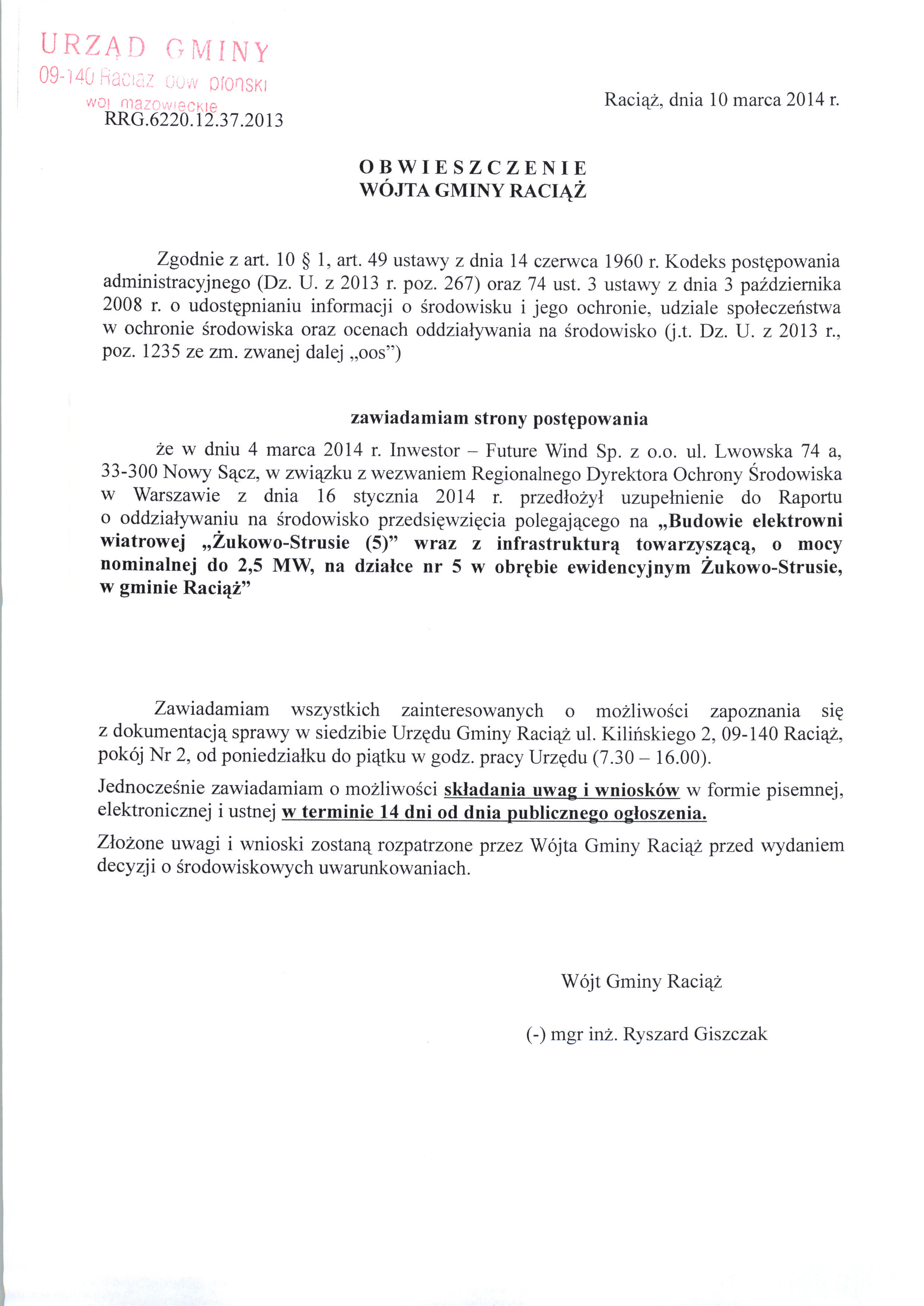 Obwieszczenie Wójta Gminy Raciąż - Obwieszczenia 2014 - Bip Gmina Raciąż