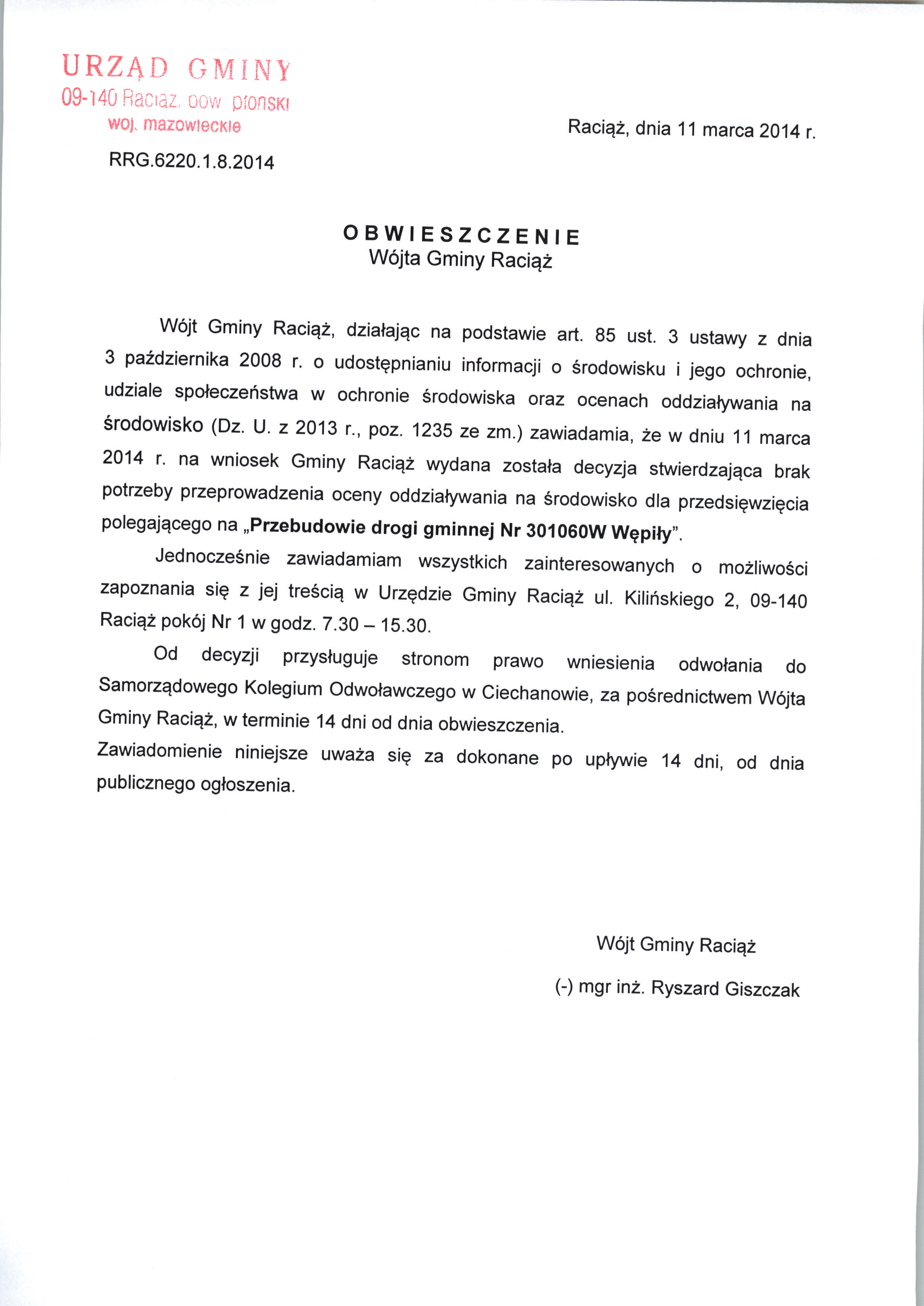 Obwieszczenie Wójta Gminy Raciąż - Obwieszczenia 2014 - Bip Gmina Raciąż