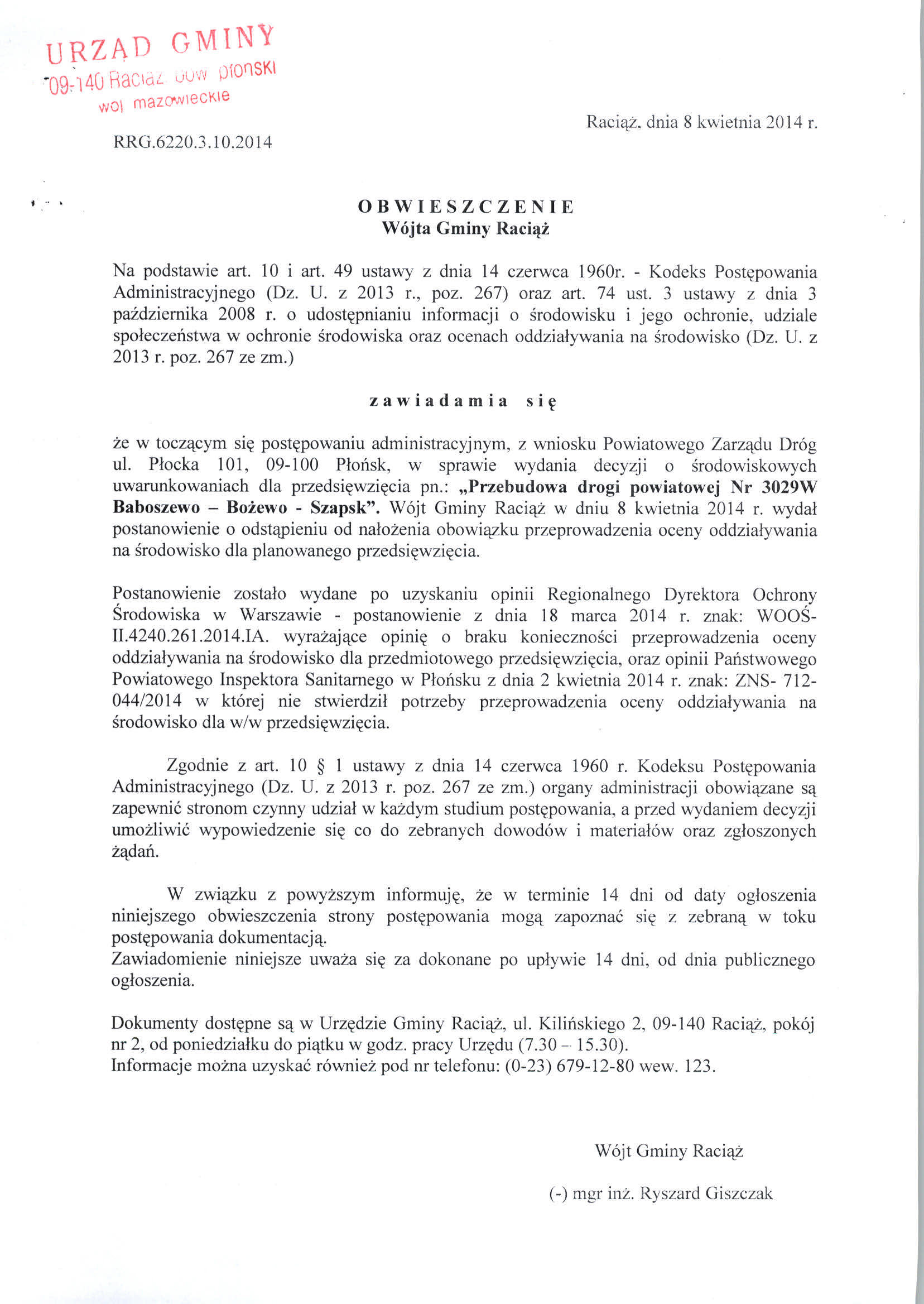 Obwieszczenie Wójta Gminy Raciąż - Obwieszczenia 2014 - Bip Gmina Raciąż