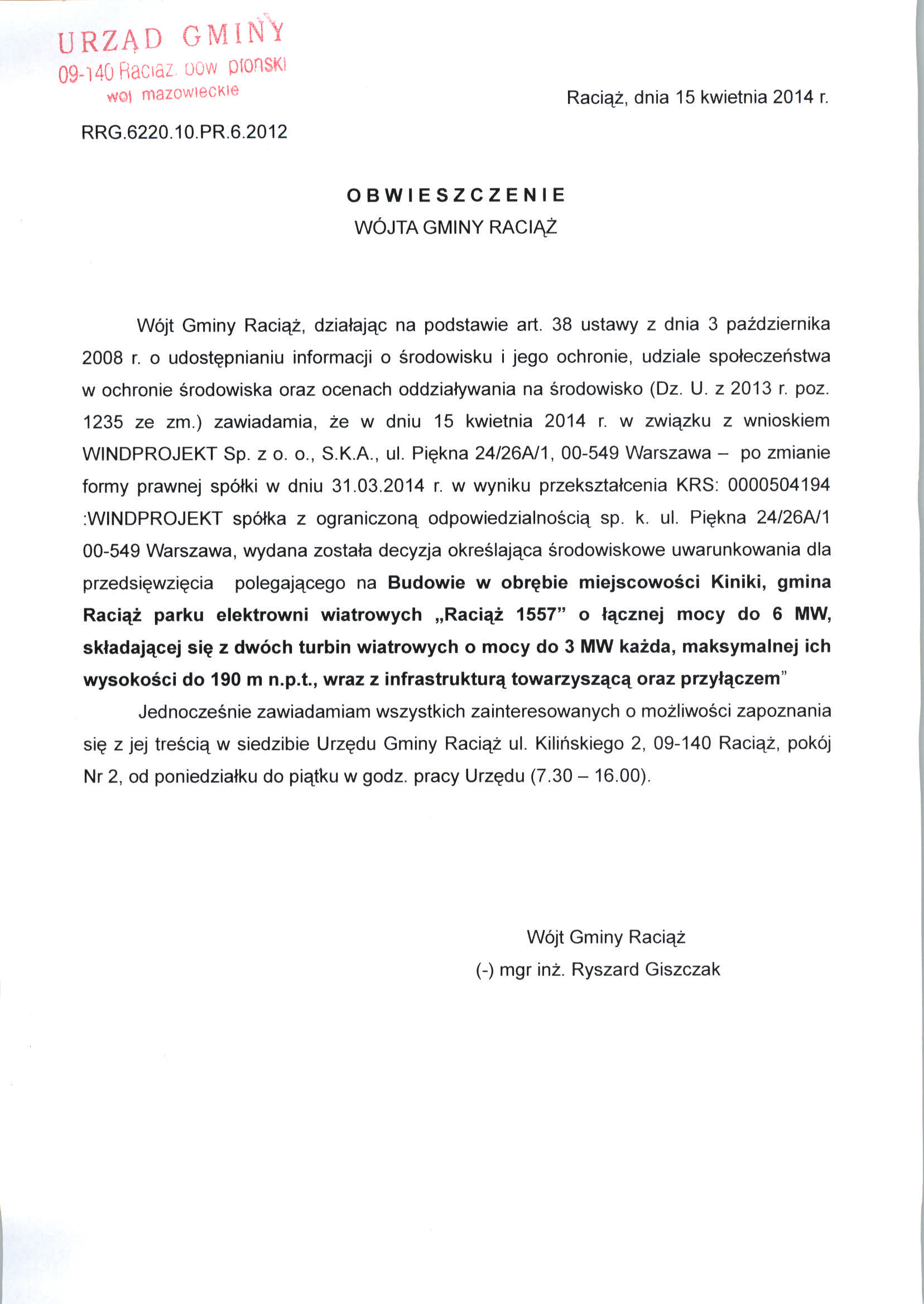 Obwieszczenie Wójta Gminy Raciąż - Obwieszczenia 2014 - Bip Gmina Raciąż
