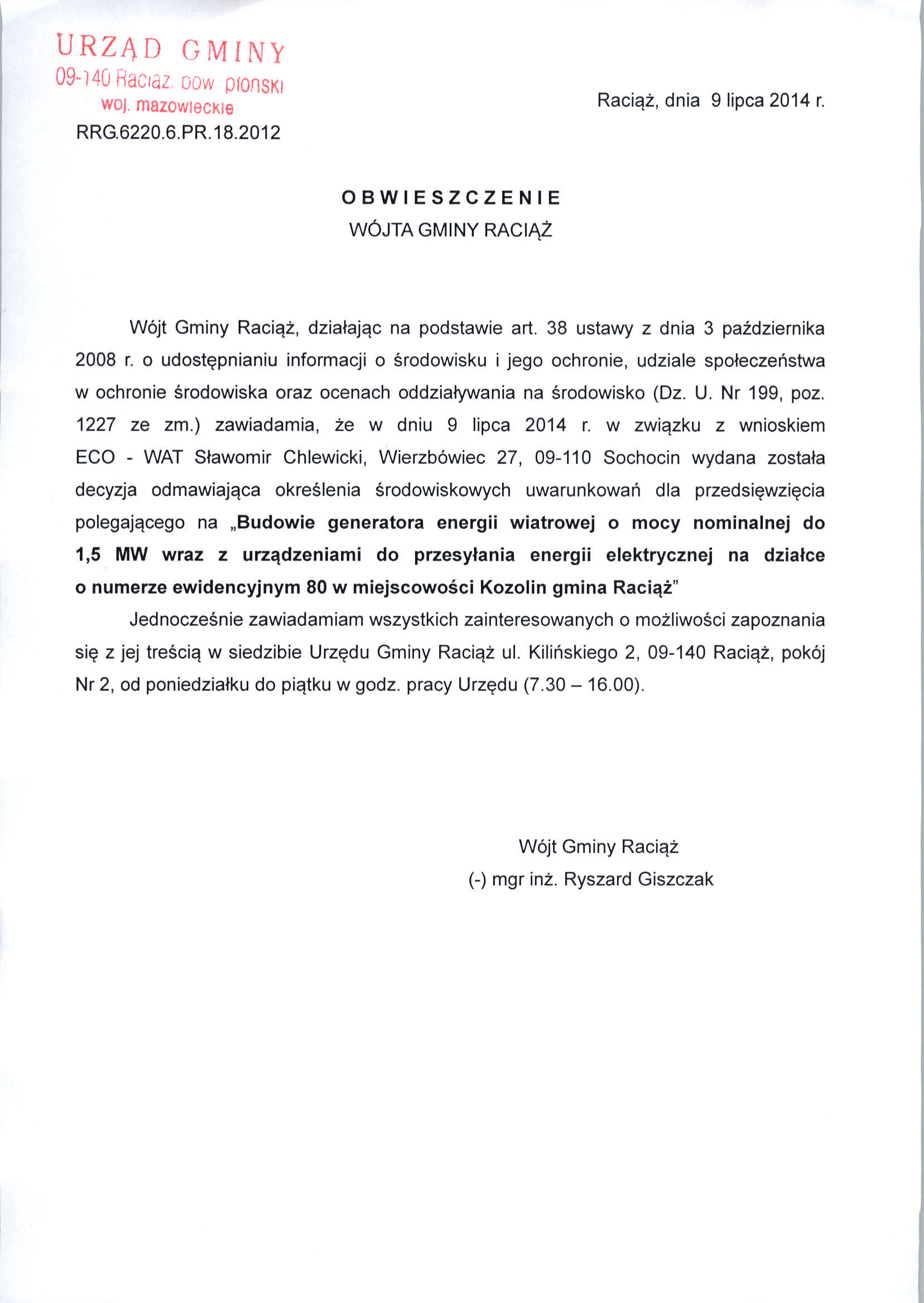 Obwieszczenie Wójta Gminy Raciąż - Obwieszczenia 2014 - Bip Gmina Raciąż
