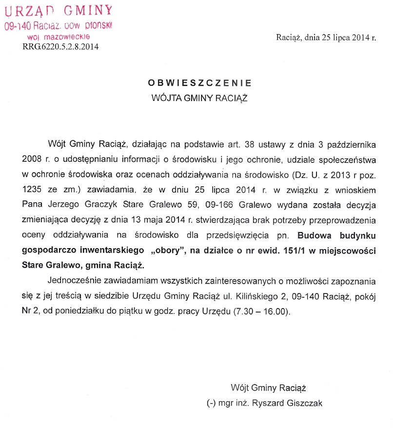 Obwieszczenie Wójta Gminy Raciąż - Obwieszczenia 2014 - Bip Gmina Raciąż