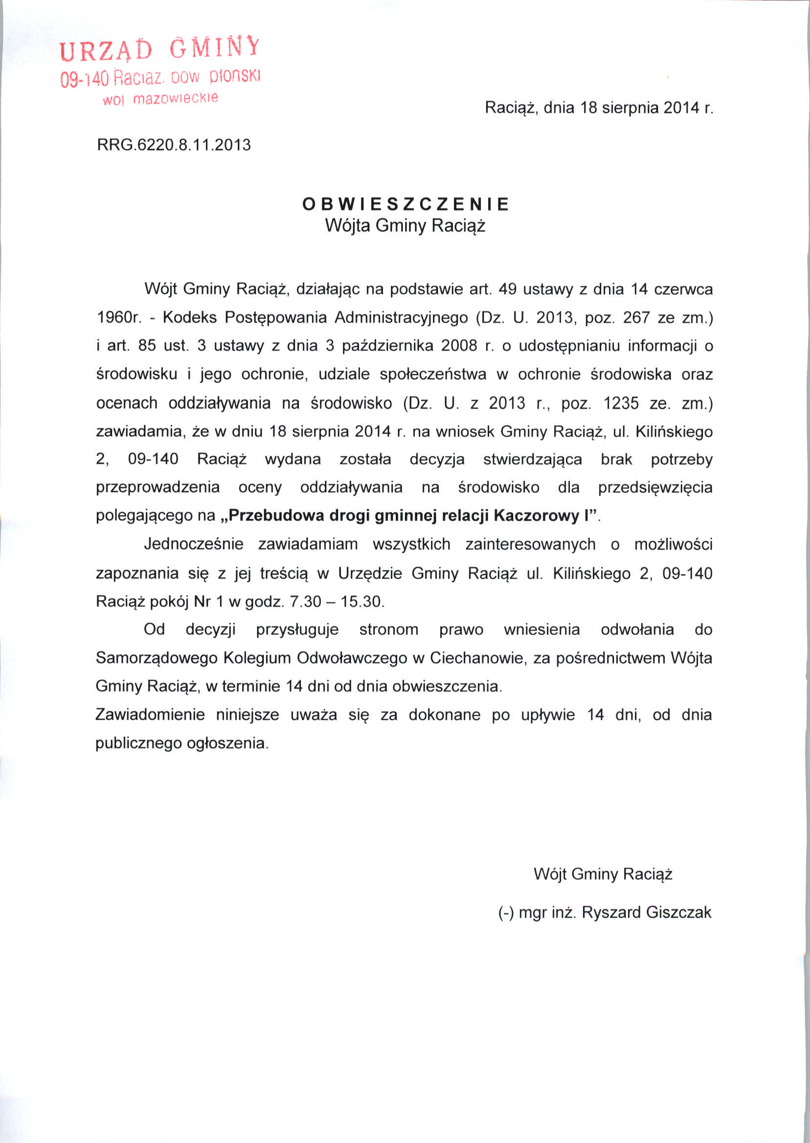 Obwieszczenie Wójta Gminy Raciąż - Obwieszczenia 2014 - Bip Gmina Raciąż