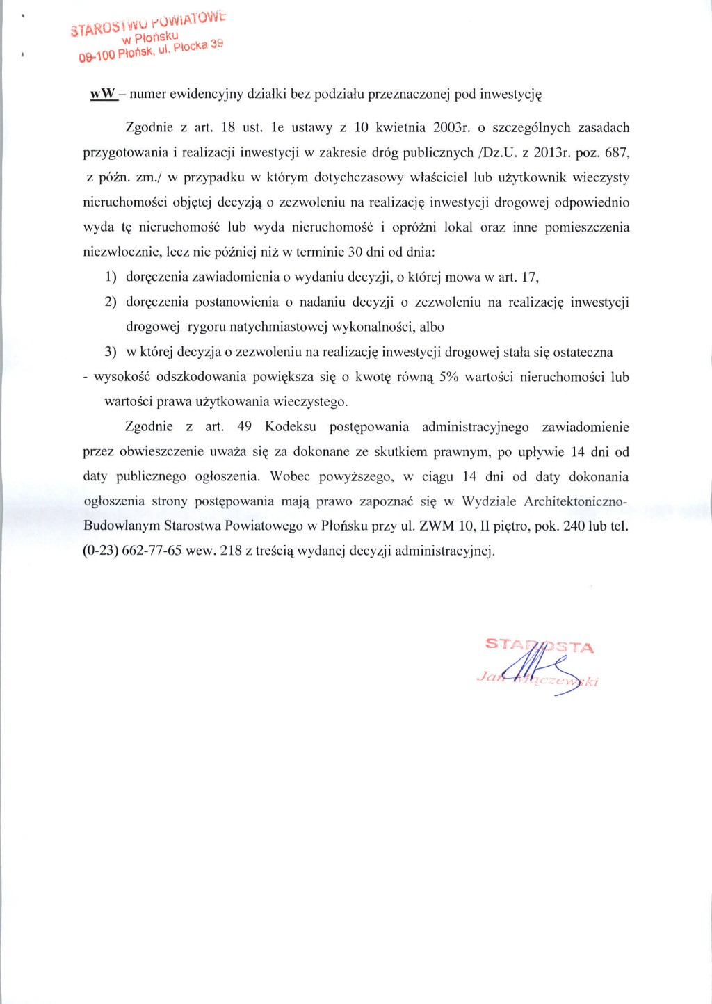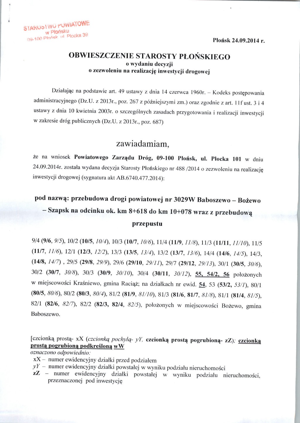 Obwieszczenie Starosty Płońskiego - Obwieszczenia 2014 - Bip Gmina Raciąż