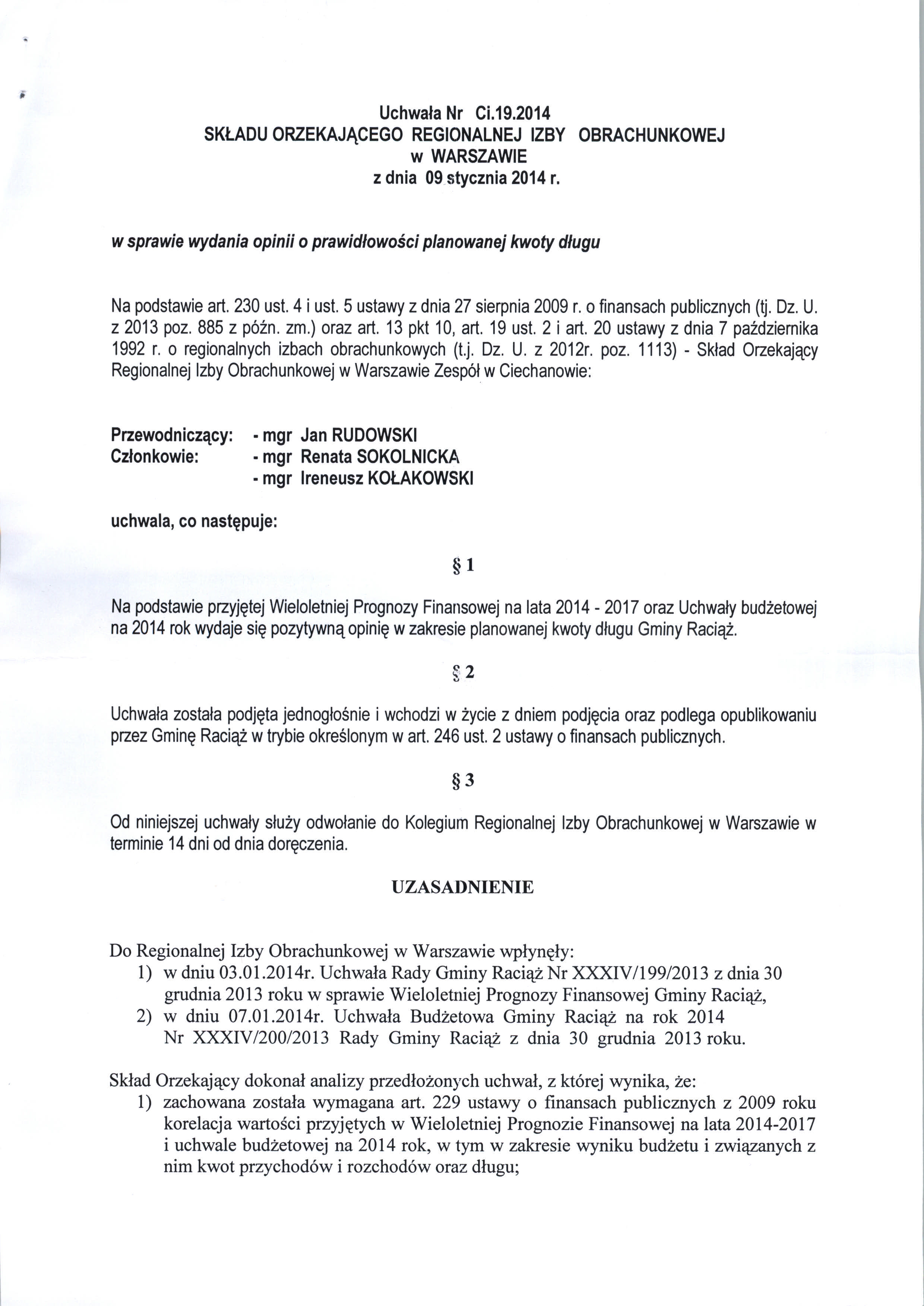 Uchwała Nr Ci.19.2014 Składu Orzekającego Regionalnej Izby Obrachunkowej w Warszawie - Uchwały 2014 - Bip Gmina Raciąż