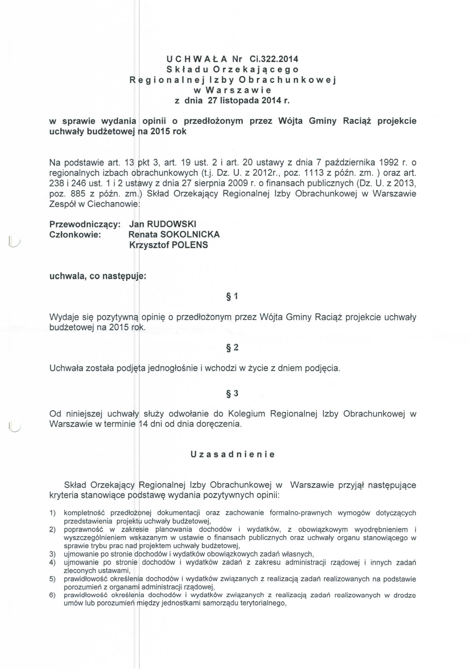 Uchwała Nr Ci.322.2014 Składu Orzekającego Regionalnej Izby Obrachunkowej w Warszawie
