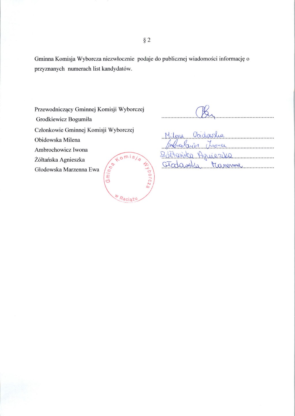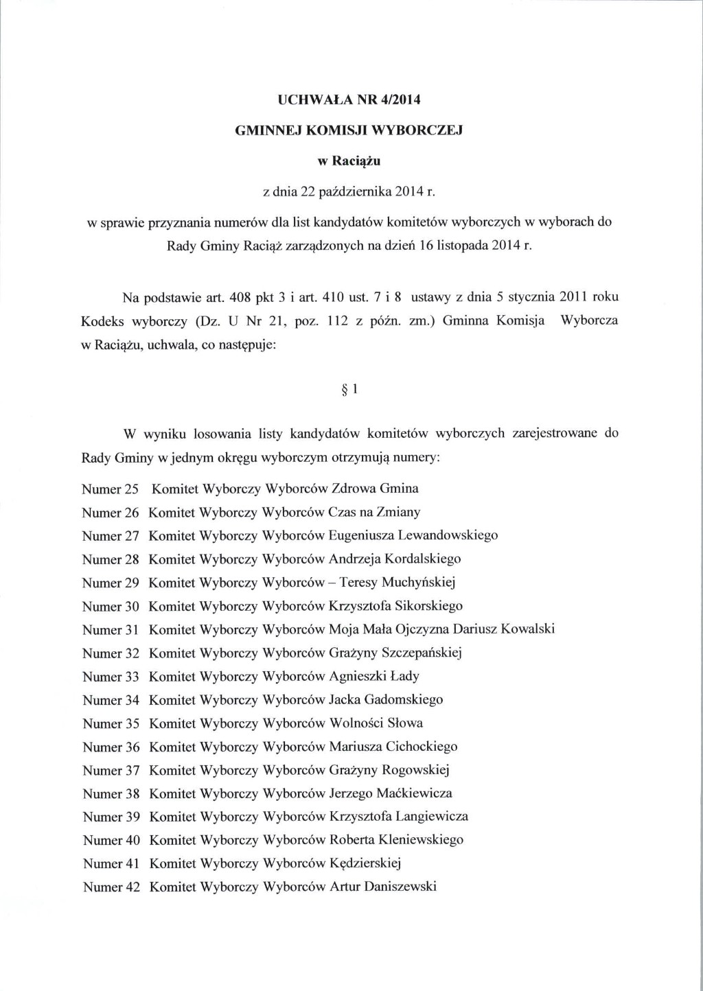 Uchwała Nr 4/2014 GKW w sprawie przyznania numerów dla list kandydatów komitetów wyborczych - Wybory Samorządowe 2014 - Bip Gmina Raciąż