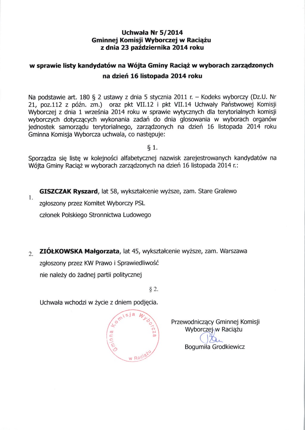 Uchwała Nr 5/2014 GKW w sprawie listy kandydatów na Wójta Gminy Raciąż - Wybory Samorządowe 2014 - Bip Gmina Raciąż