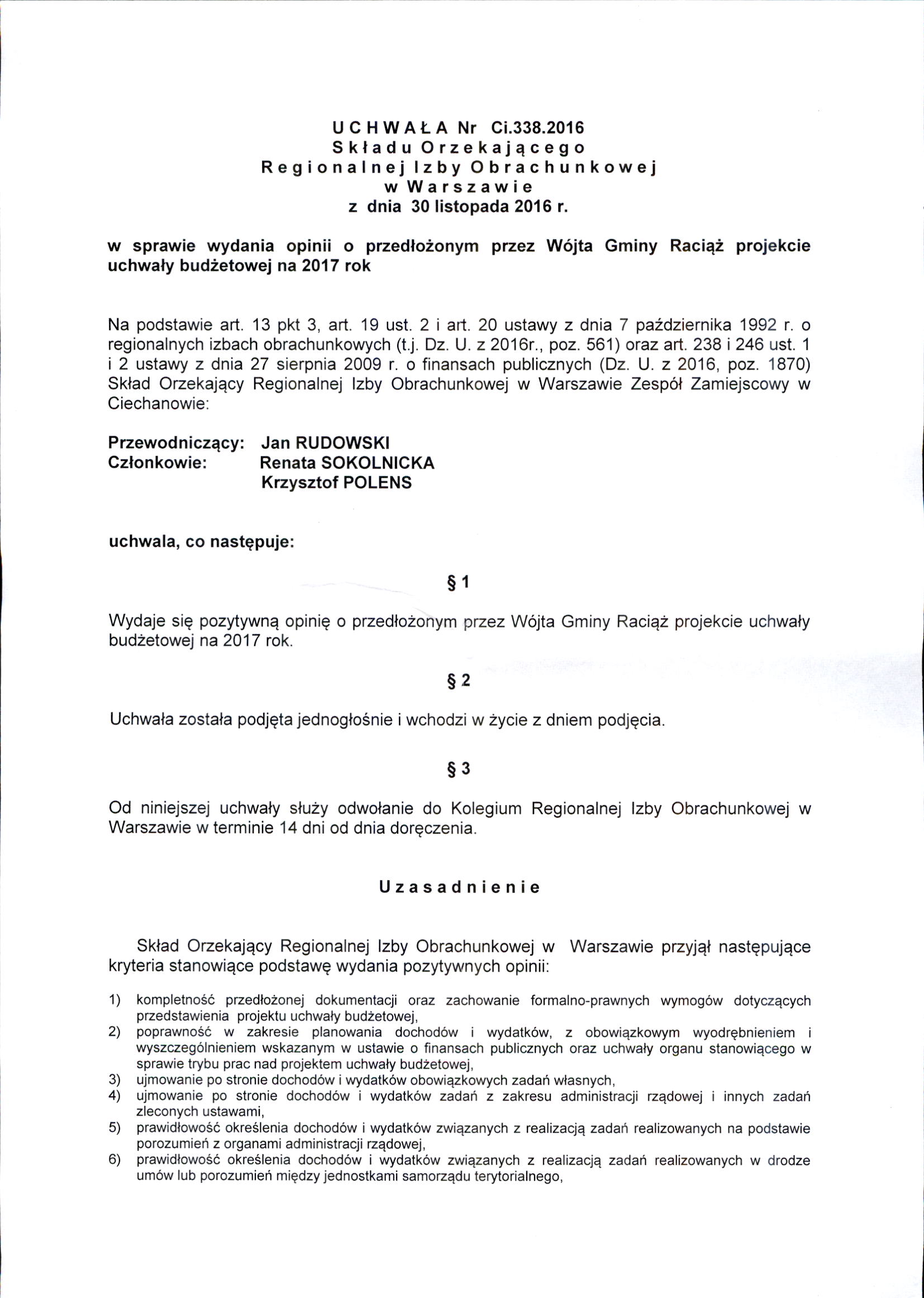 Uchwała Nr Ci.338.2016 Składu Orzekającego Regionalnej Izby Obrachunkowej w Warszawie - Uchwały 2016 - Bip Gmina Raciąż