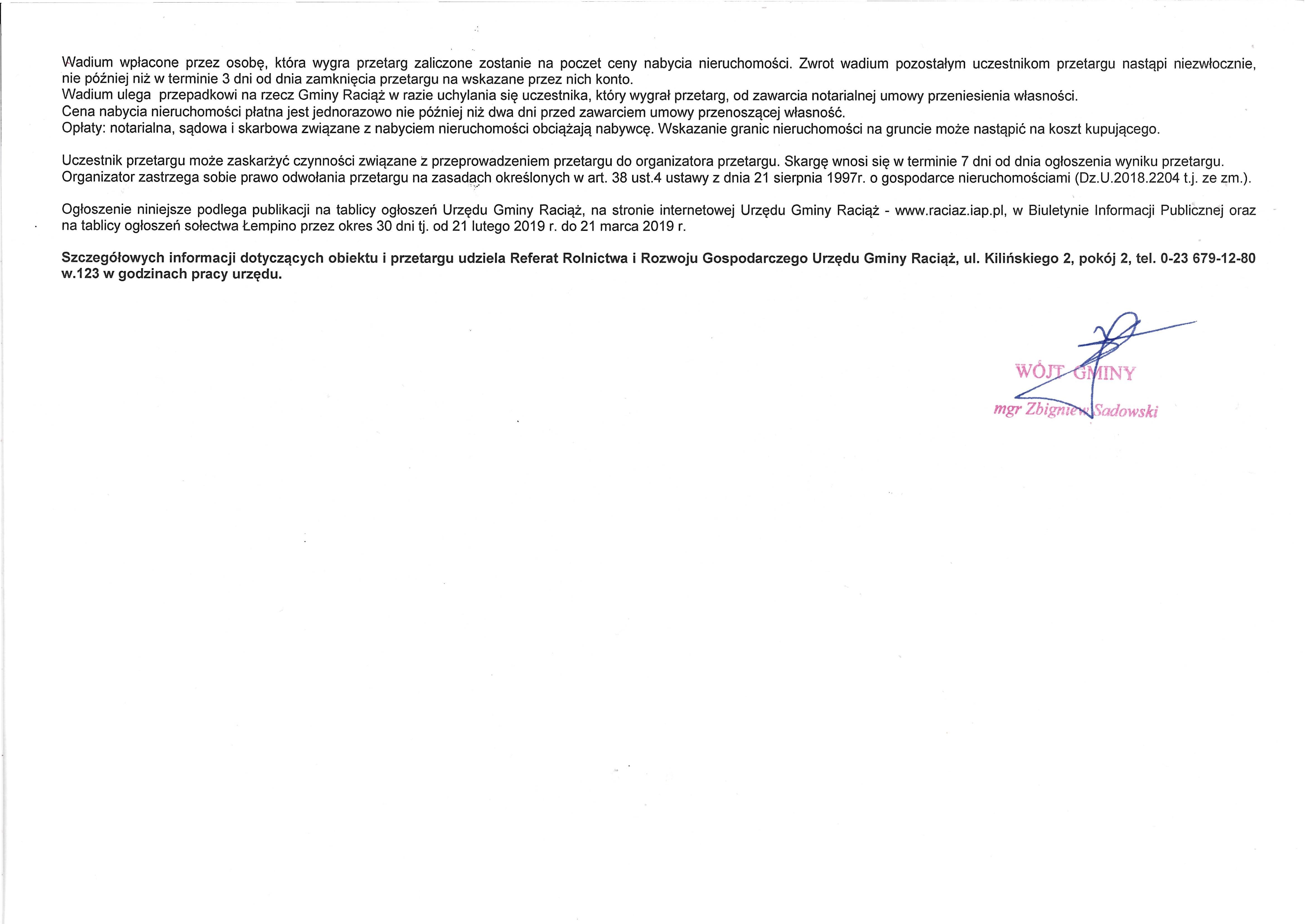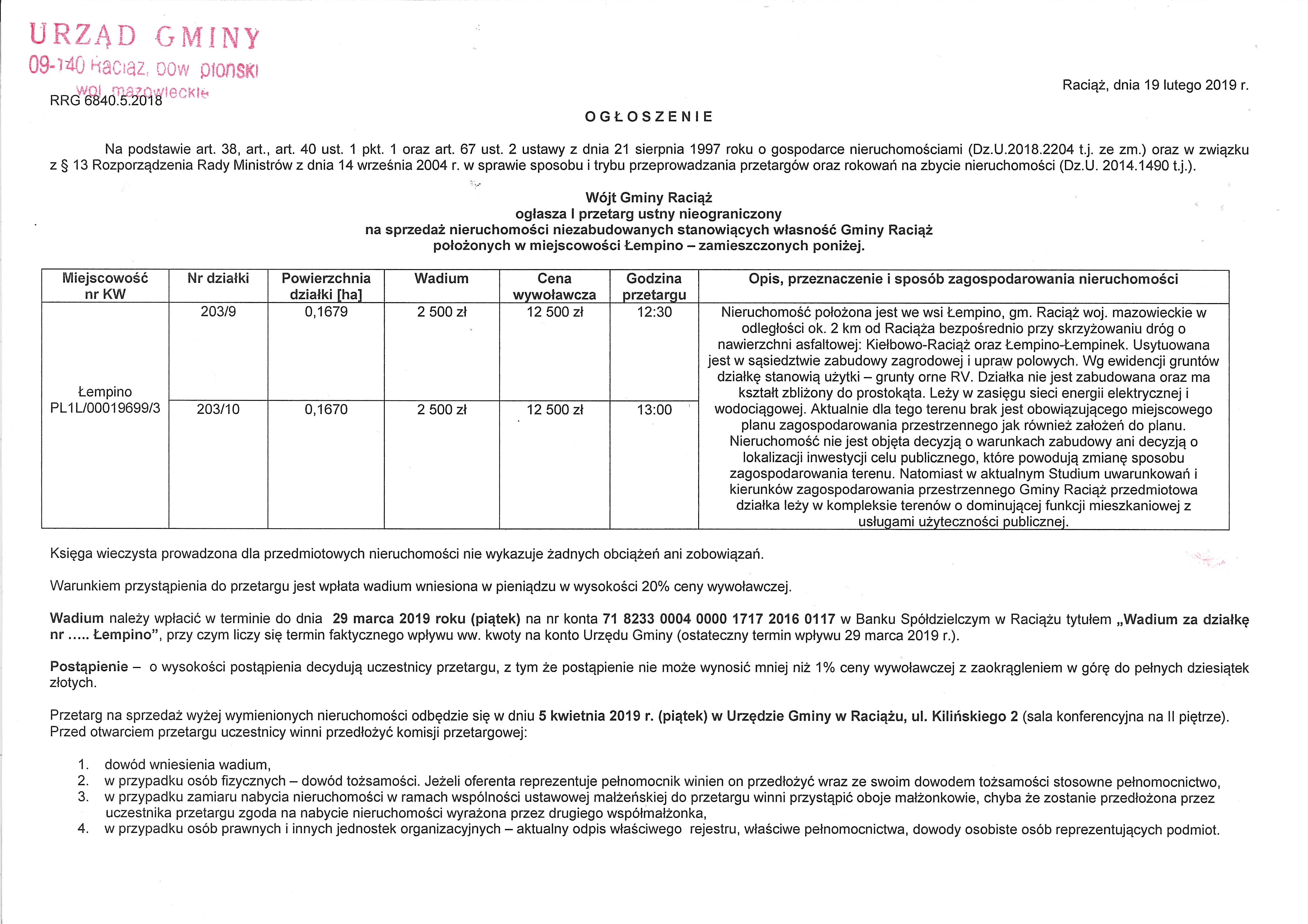 Wójt Gminy Raciąż ogłasza I przetarg ustny nieograniczony na sprzedaż nieruchomości niezabudowanych stanowiących własność Gminy Raciąż położonych w miejscowości Łempino