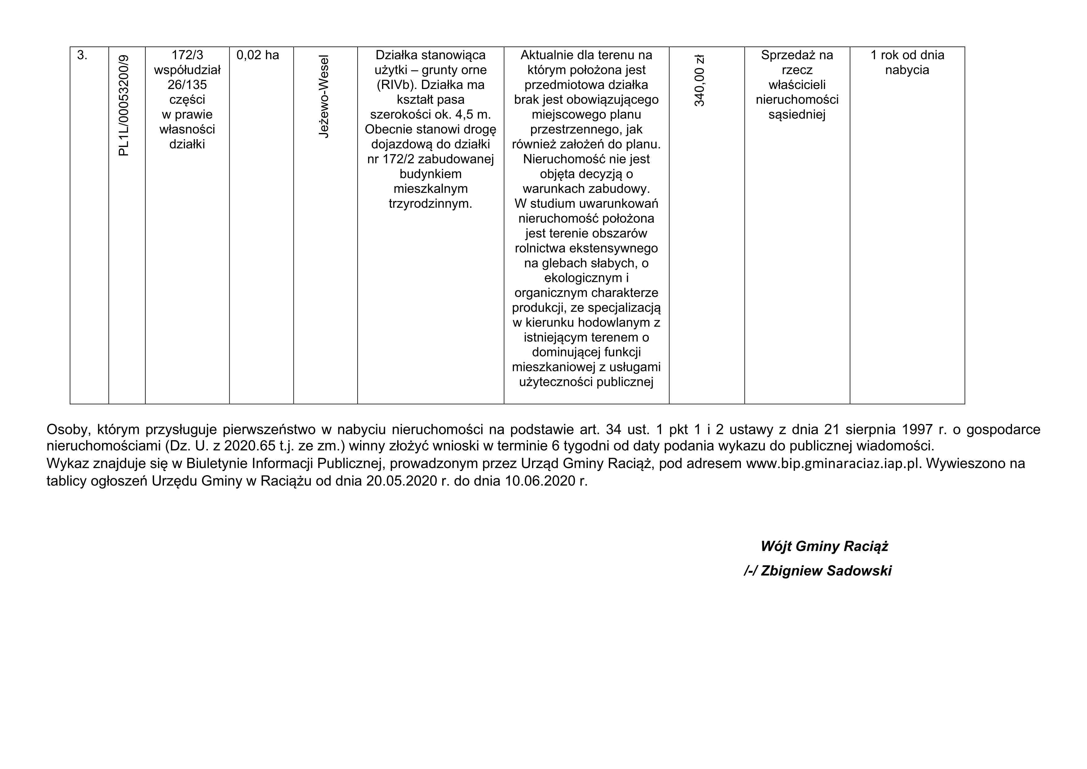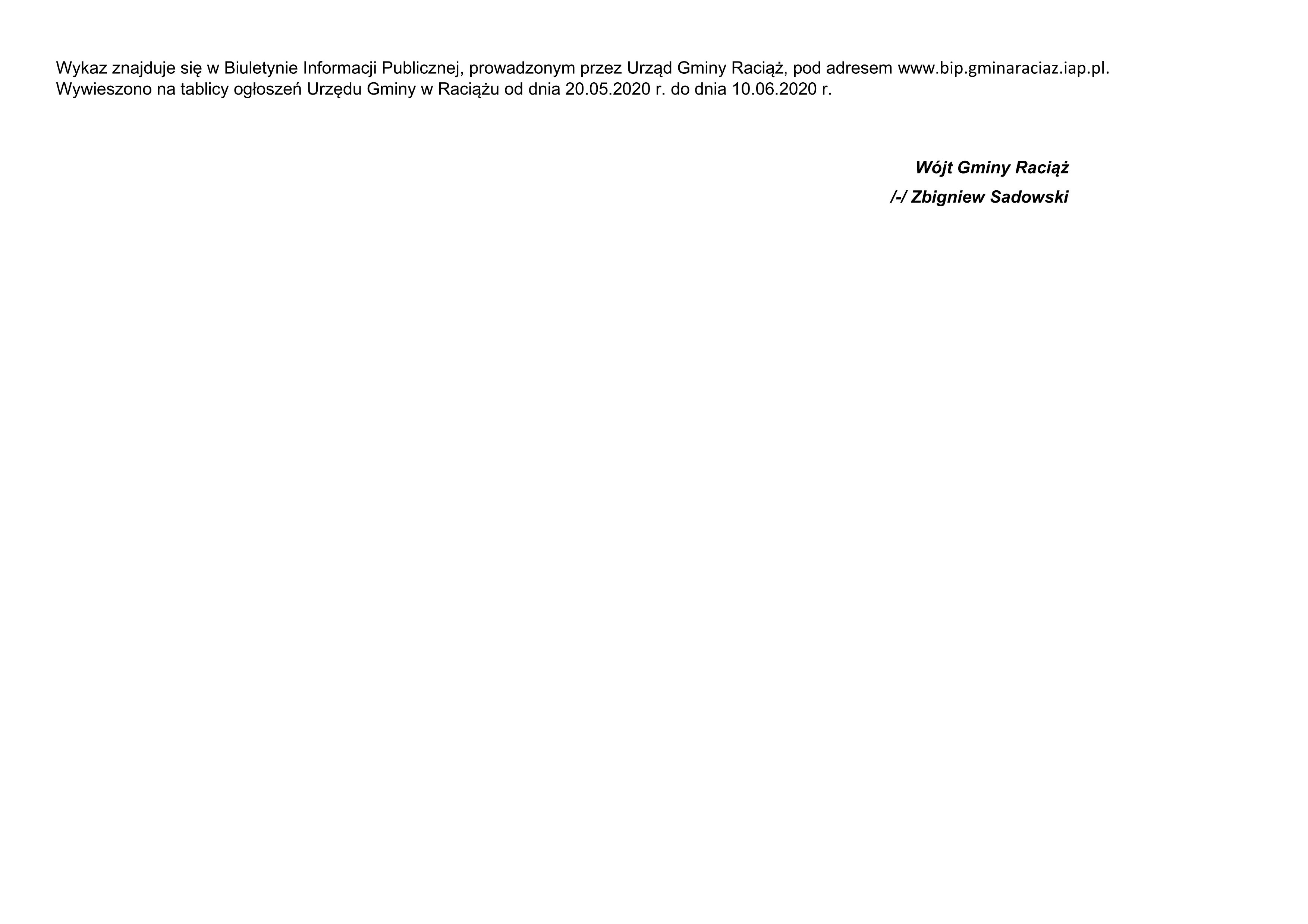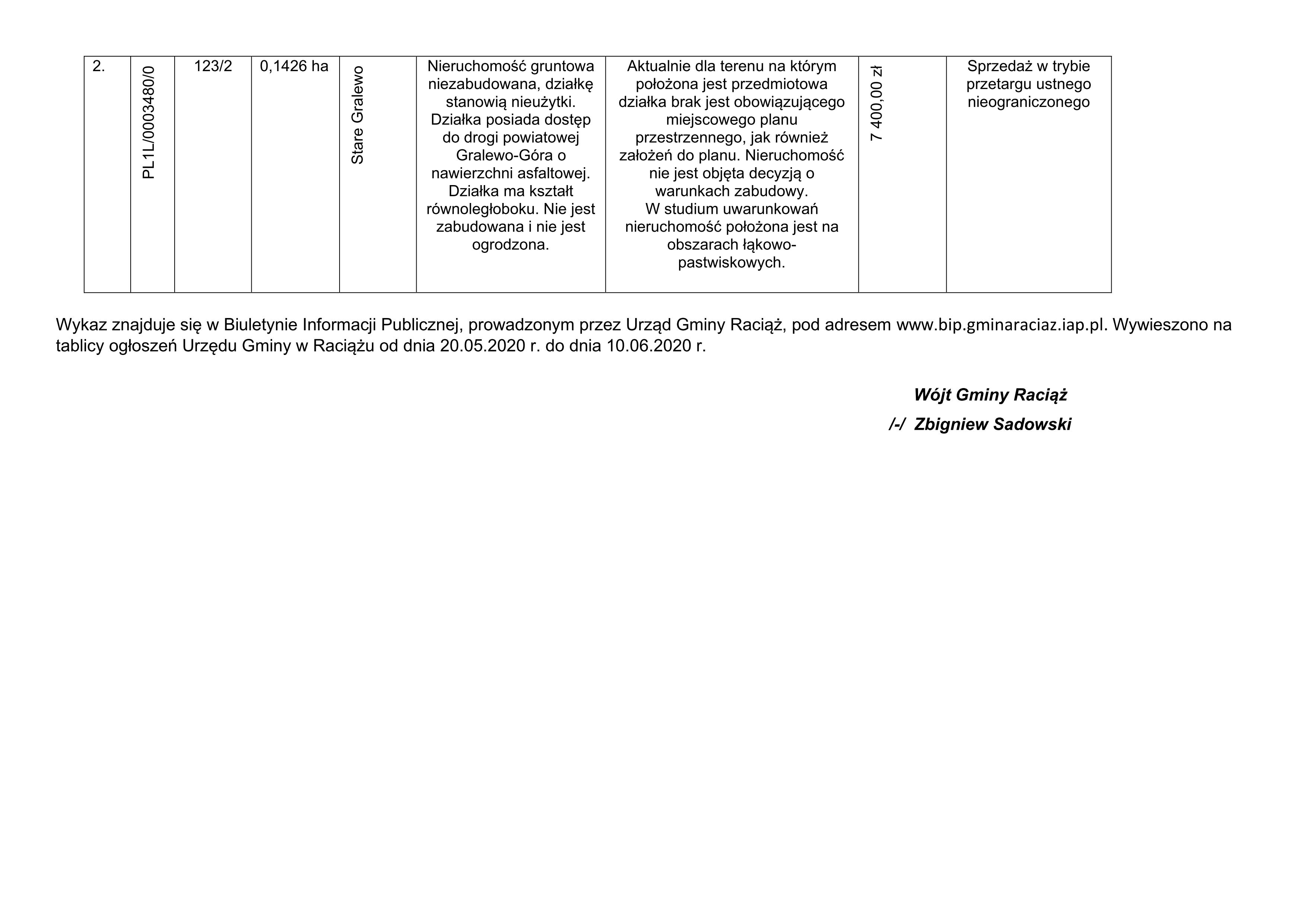 Wójt Gminy Raciąż podaje do publicznej wiadomości wykaz nieruchomości przeznaczonych do sprzedaży.