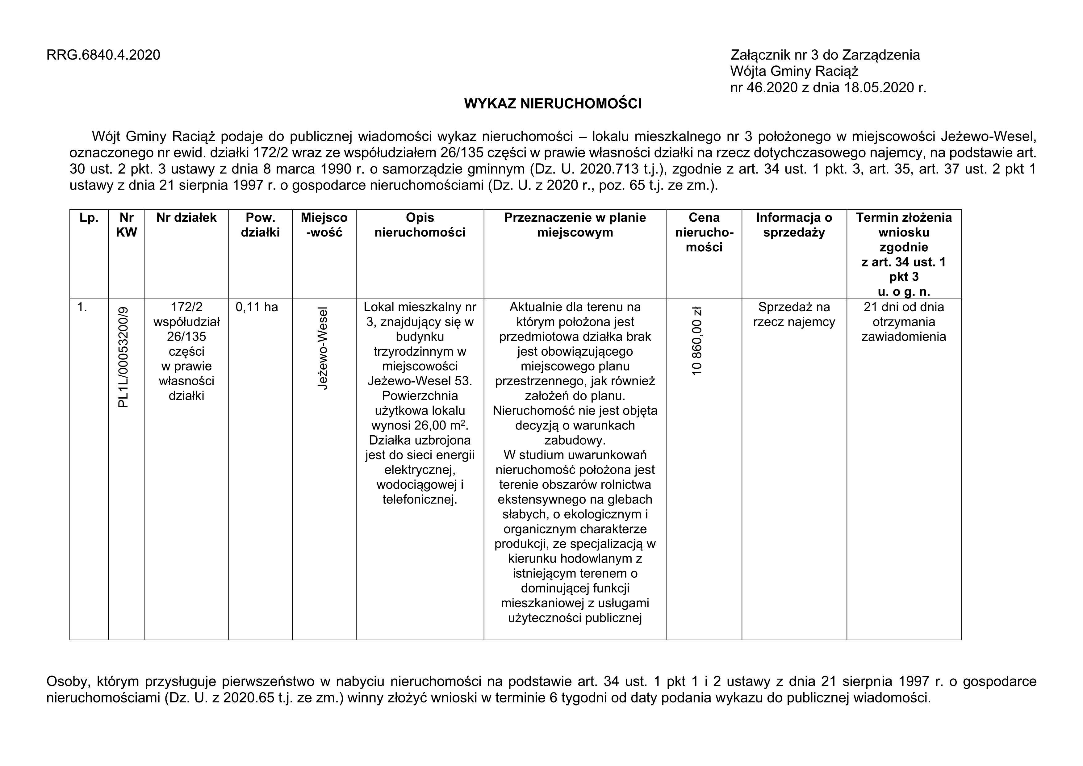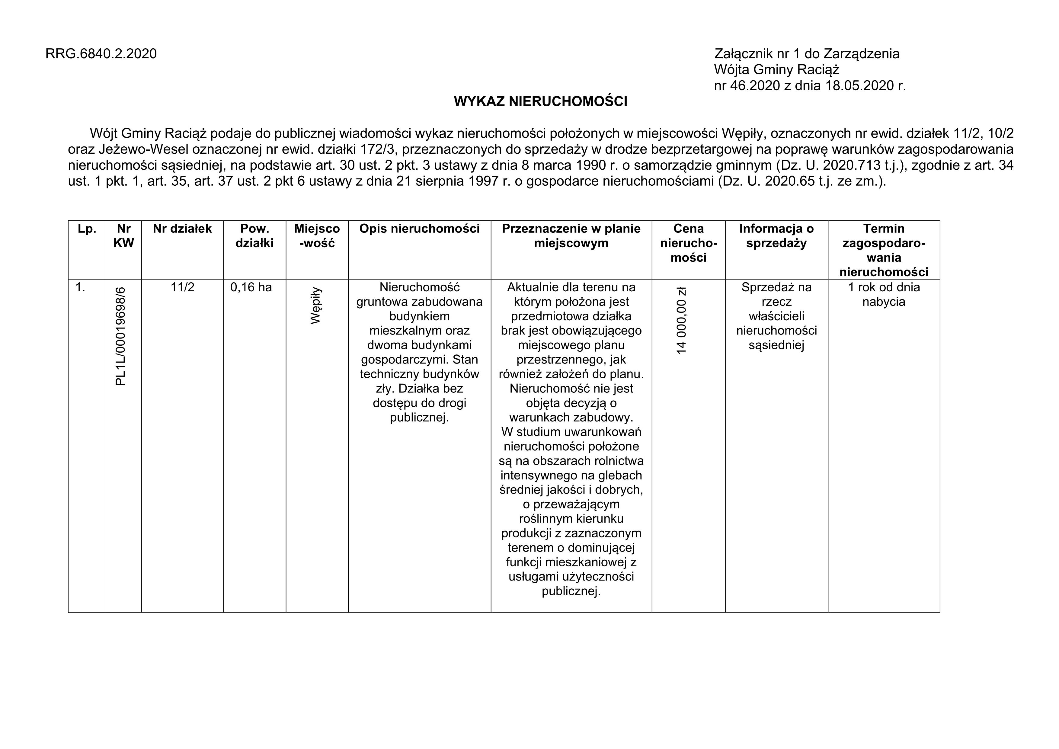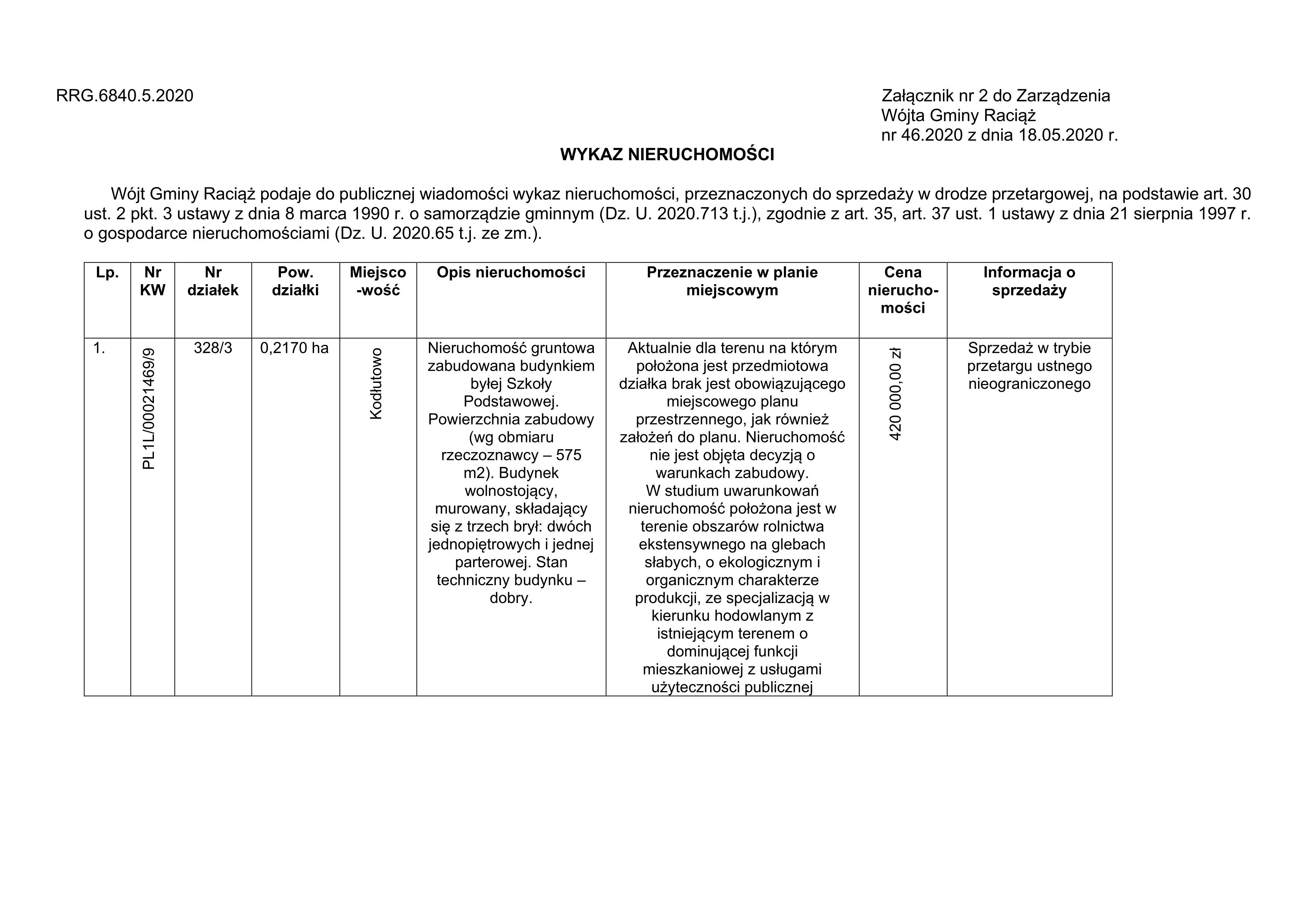Wójt Gminy Raciąż podaje do publicznej wiadomości wykaz nieruchomości przeznaczonych do sprzedaży.