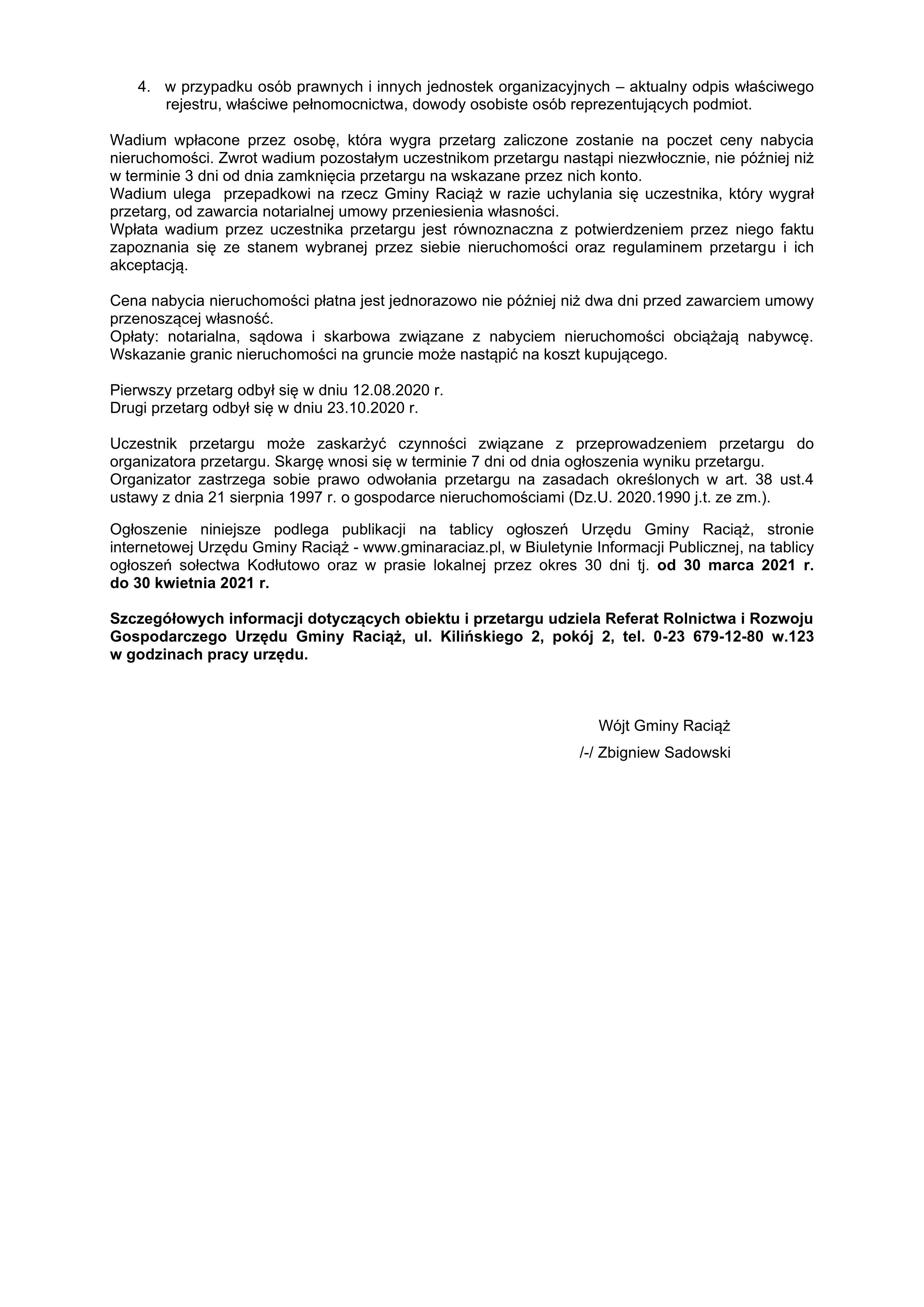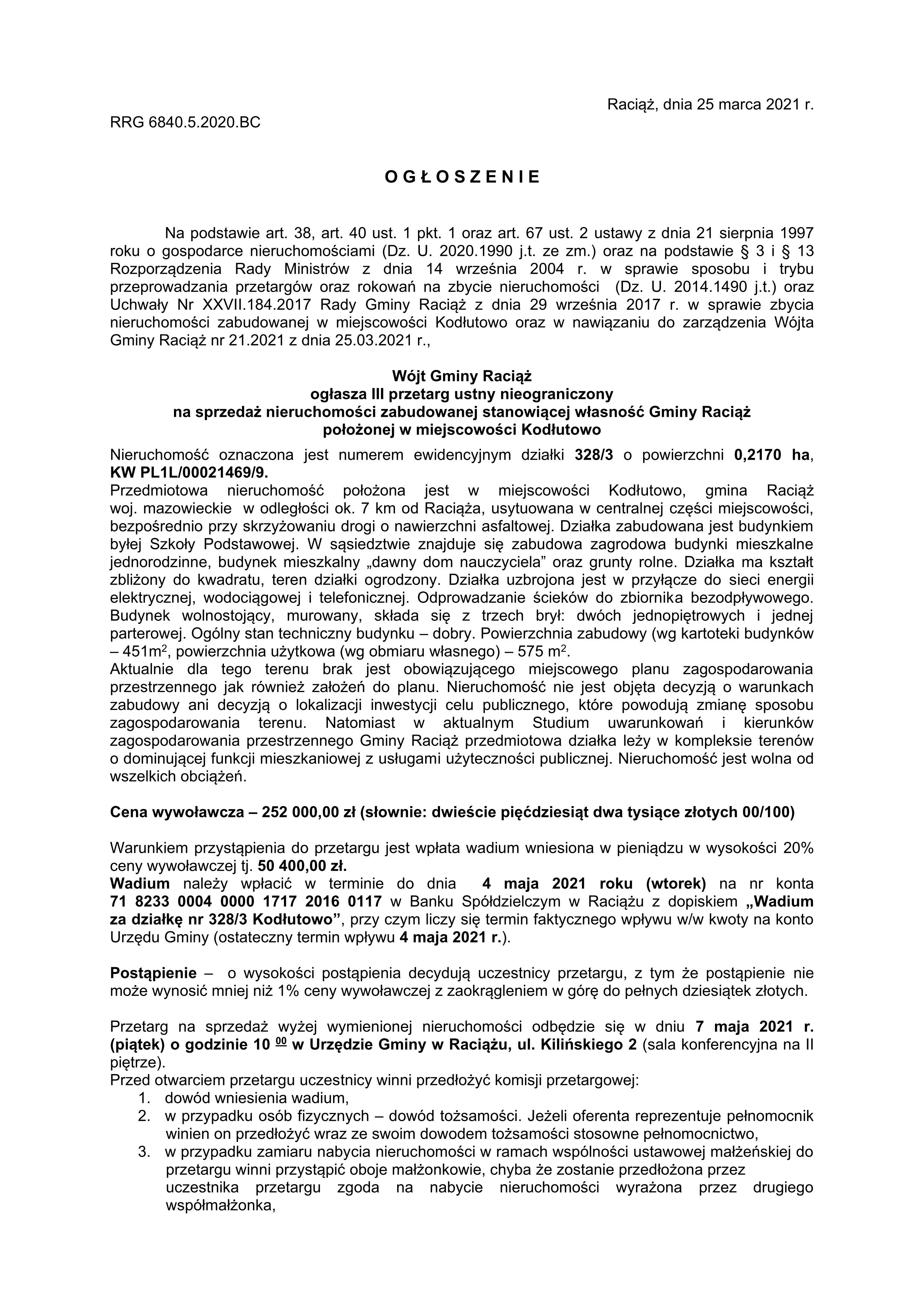 Wójt Gminy Raciąż ogłasza III przetarg ustny nieograniczony na sprzedaż nieruchomości zabudowanej stanowiącej własność Gminy Raciąż położonej w miejscowości Kodłutowo.