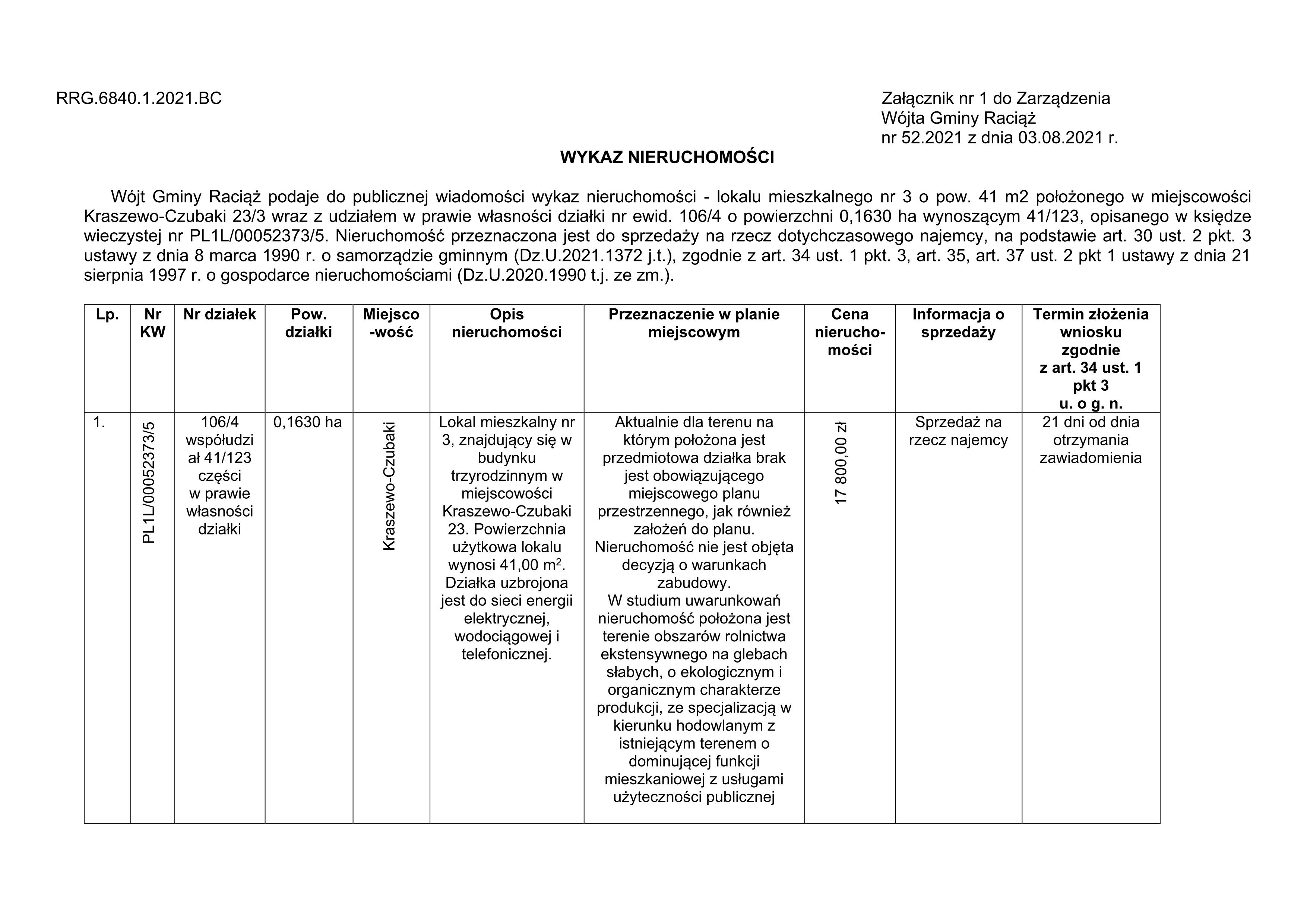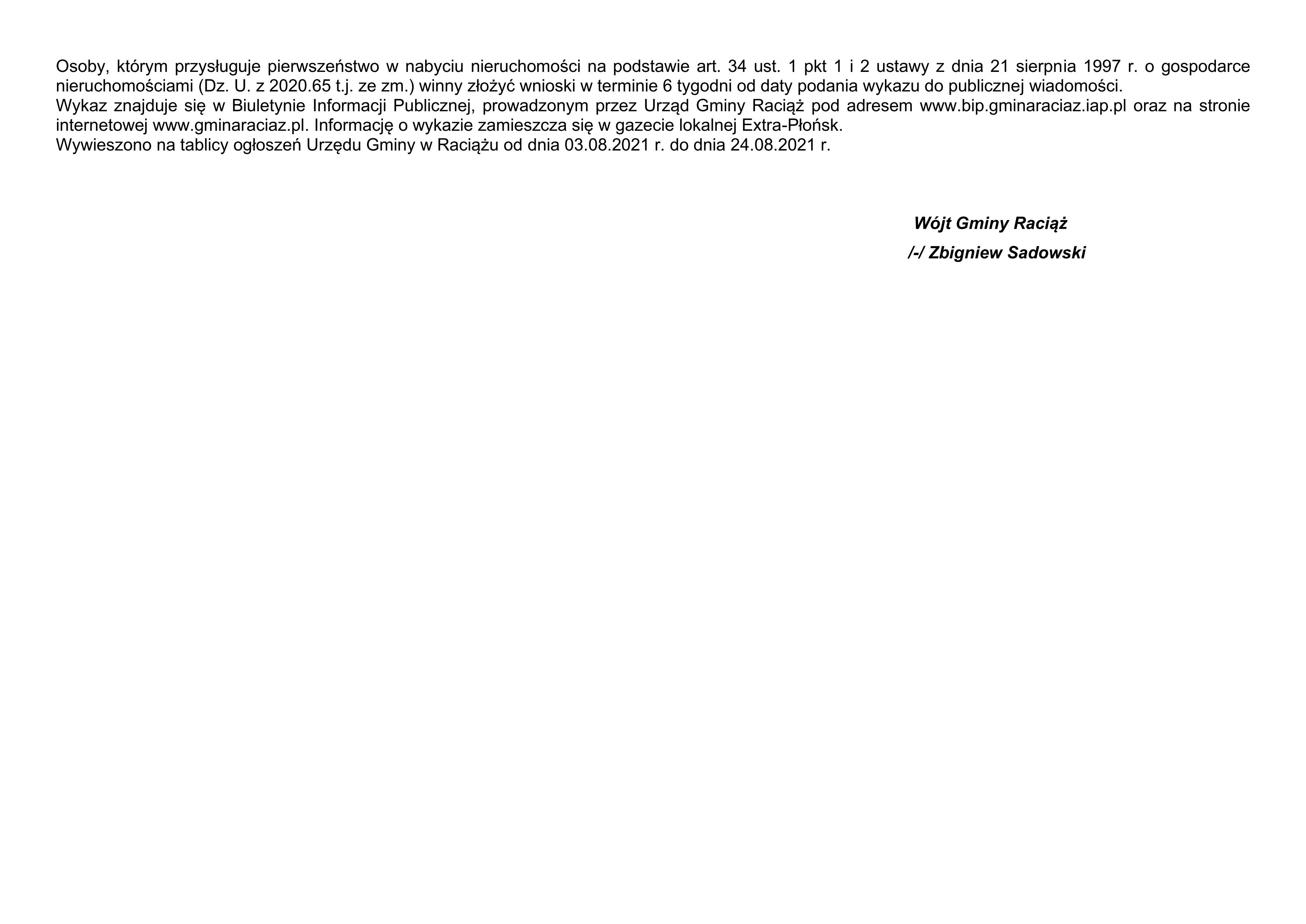 Wójt Gminy Raciąż podaje do publicznej wiadomości wykaz nieruchomości przeznaczonej do sprzedaży w trybie bezprzetargowym na rzecz dotychczasowego najemcy.