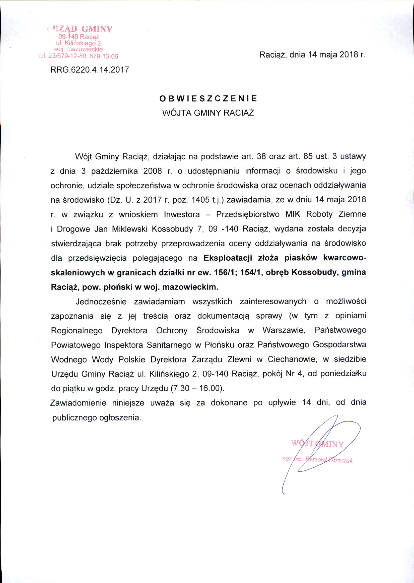 Obwieszczenie Wójta Gminy Raciąż - Obwieszczenia 2018 - Bip Gmina Raciąż