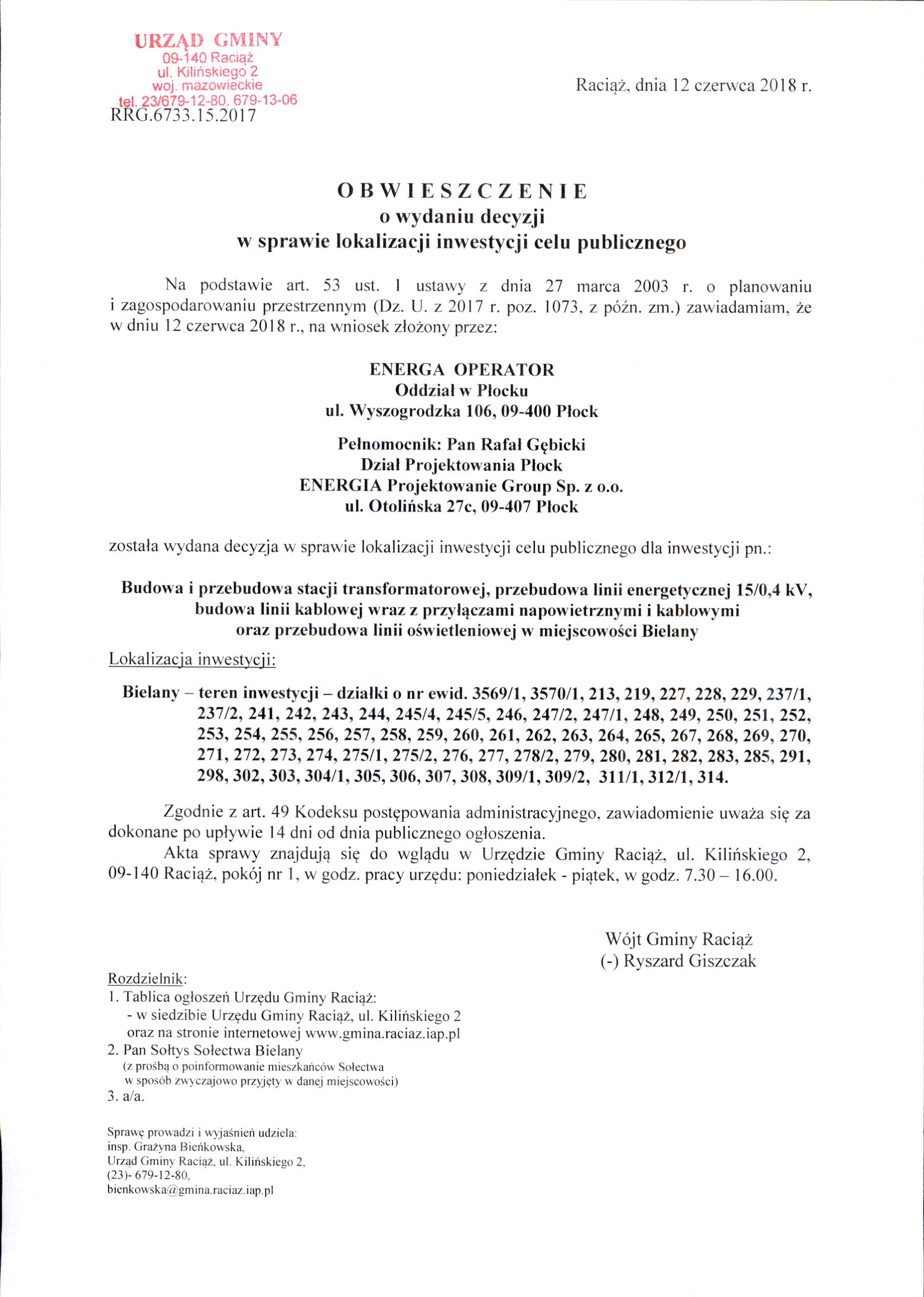 Obwieszczenie - Obwieszczenia 2018 - Bip Gmina Raciąż