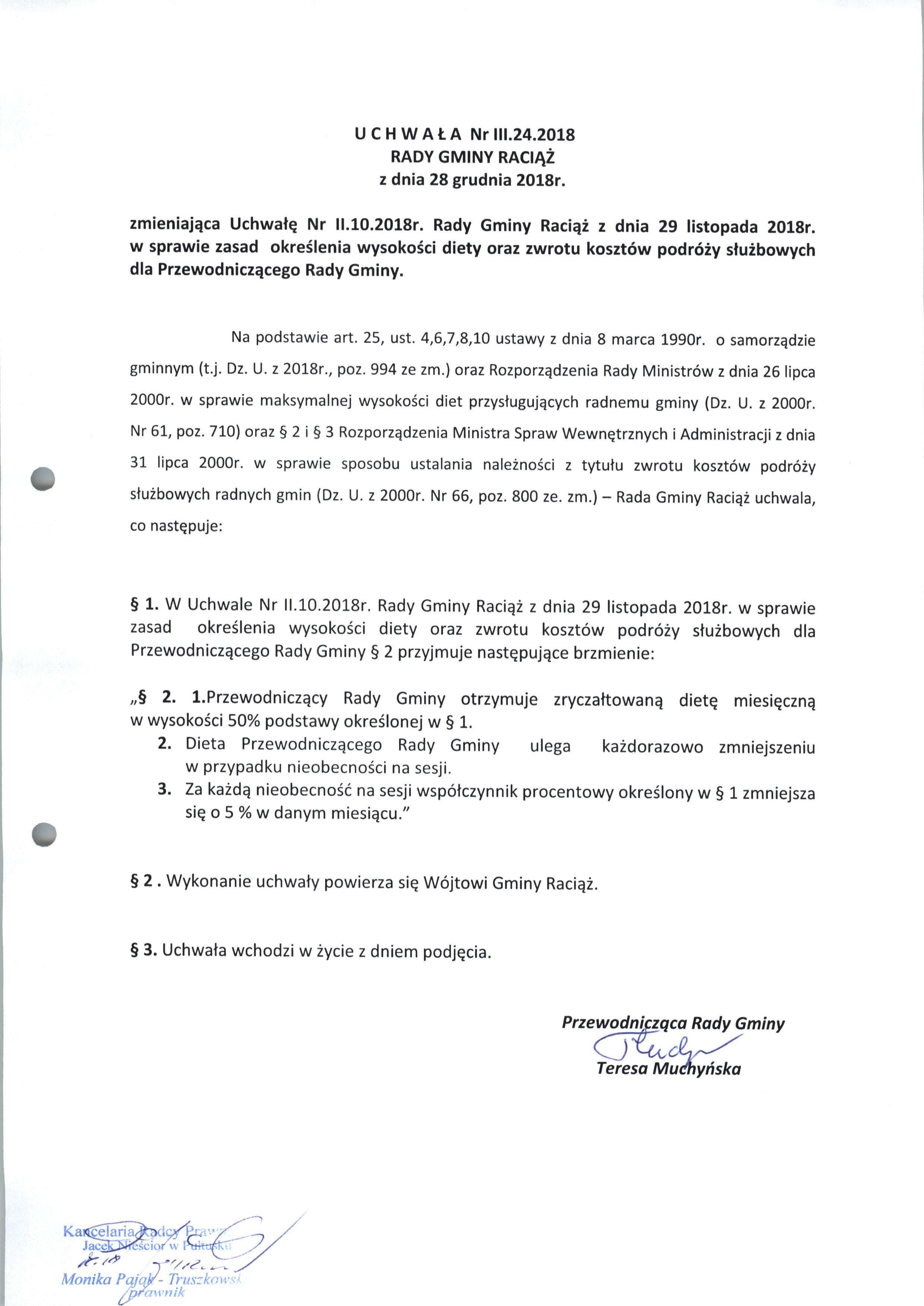 Uchwała Nr.III.24.2018 RADY GMINY RACIĄŻ z dnia 28 grudnia 2018 roku w sprawie zasad określenia wysokości diety oraz zwrotu kosztów podróży służbowych dla Przewodniczącego Rady Gminy.